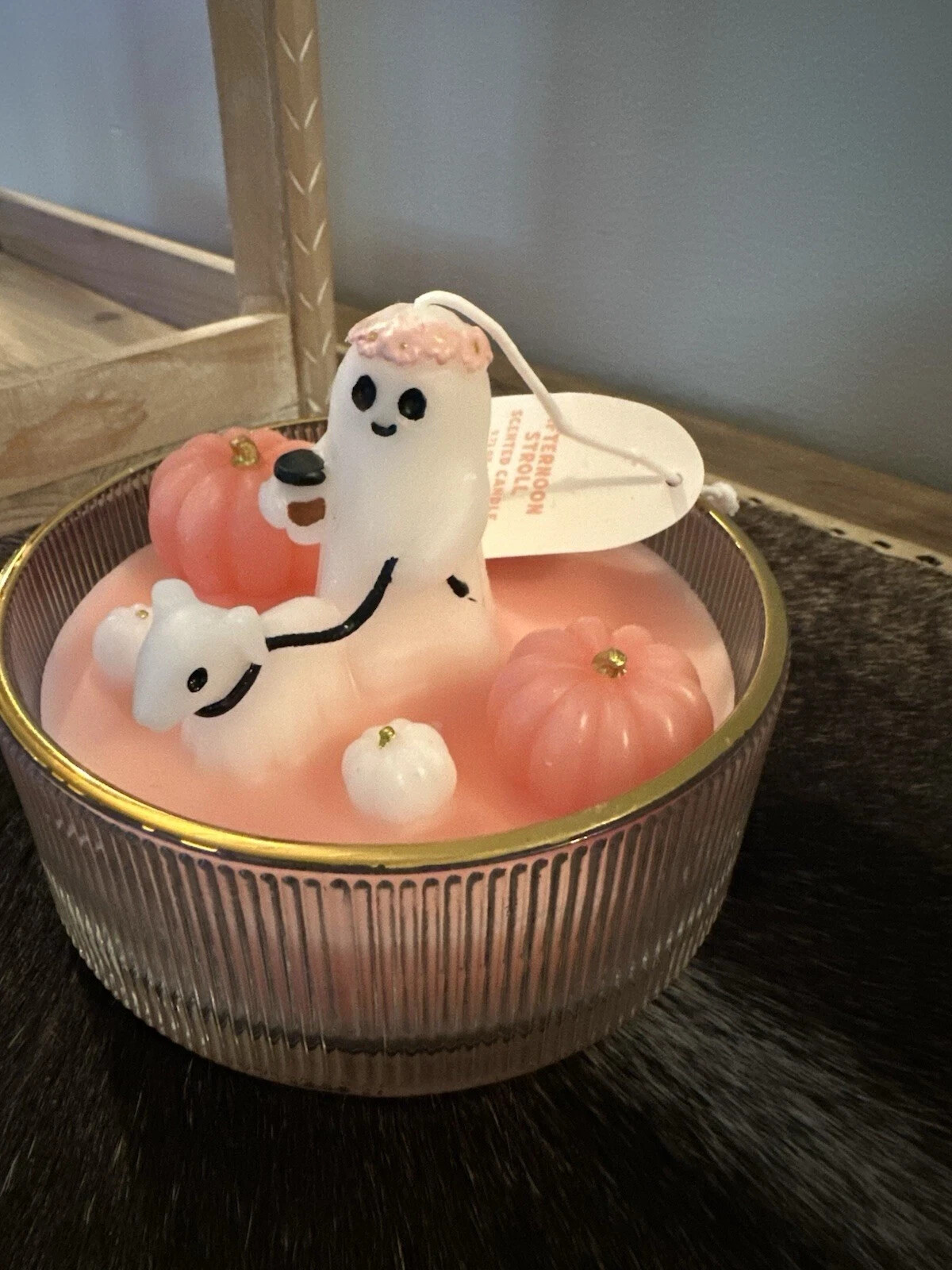 9oz Ghost And Dog In Pumpkin Patch Summerween Candle afternoon stroll scented, holiday themed, textured decorative glass jar, gold tone detail 5in D x 3.5in H