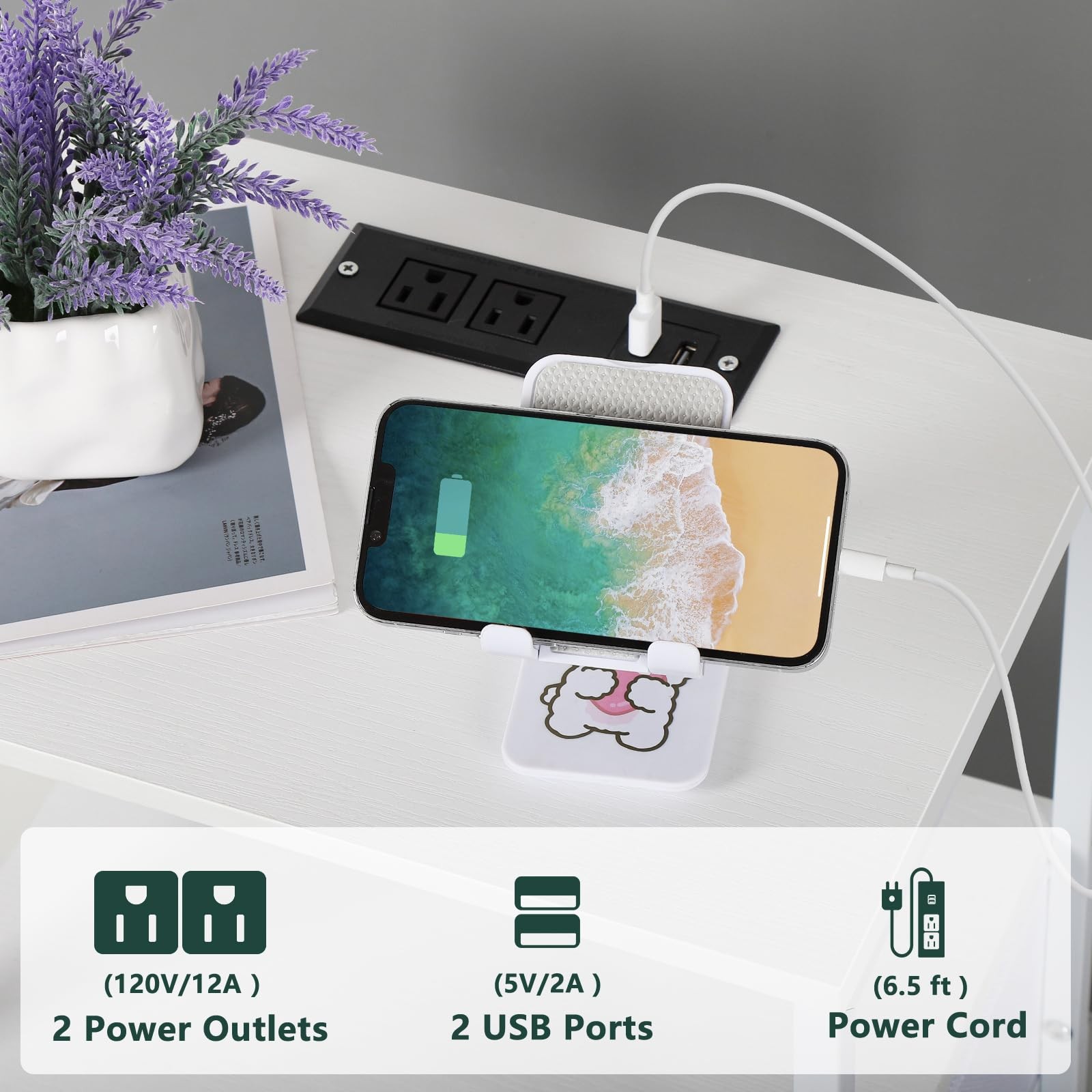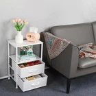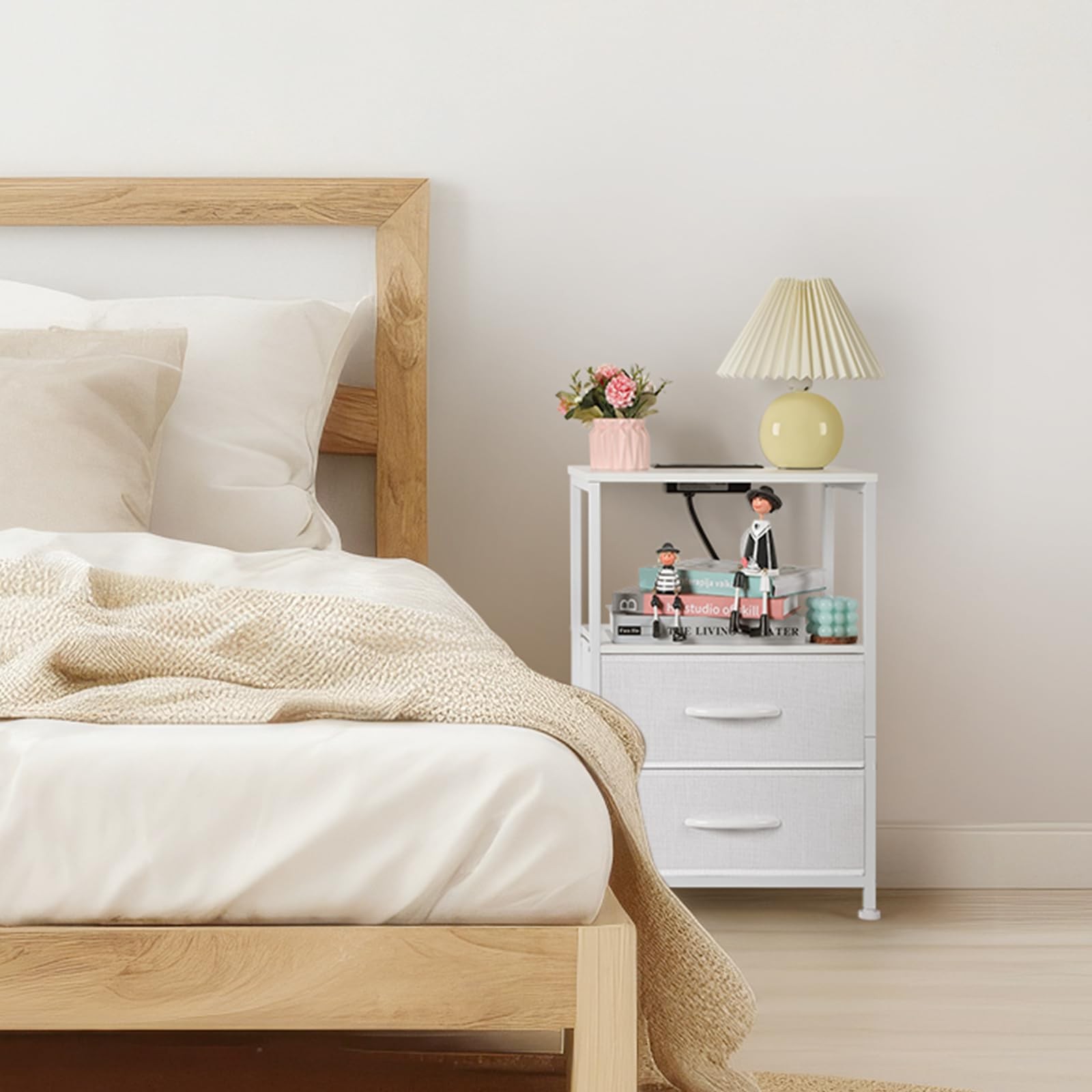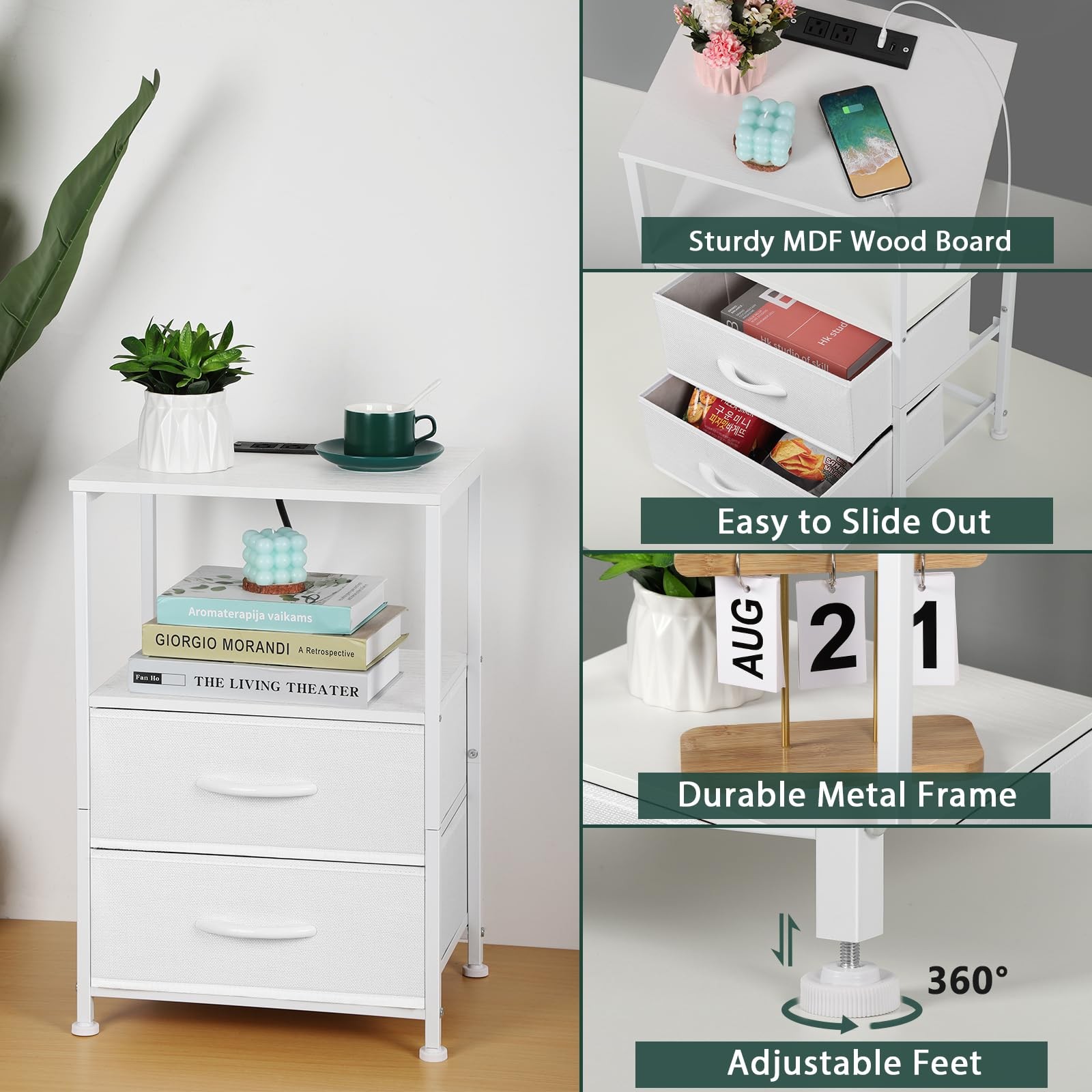 Nightstand with Charging Station Made of MDF wood board and metal steel frame, all details blend together to create a beautiful look that is easily added to styles from modern to classic. No matter how you want to decorate your room, this night stand is always the perfect piece of furniture The bedside table has two drawers, a top shelf, and open storage. 2 drawers set on smooth rails provide secluded storage for personal necessities, and pulling the handle is simple and quiet. The spacious top surface provides plenty of room for a lamp, alarm clock, phone, charger, glasses, and a glass of water. Open storage is perfect for books and decorations Practical and stylish: The desktop has a charging station, 2 AC power outlets, and 2 USB ports; Easy charging of your mobile phone, and other devices, a bedside table within reach, a corner organizing table at the entrance, or a useful sofa side table in the living room for a variety of family scenarios. Easy assembly: Includes hardware and can be easily assembled. Following the instructions, you can put it together in several steps. Equipped with adjustable metal plastic foot pads; To accommodate uneven surfaces and prevent scratching the floor. Specification: Material: Metal+Fabric Color: White Size: 15.75*11.82*23.82 Package Including: 1*nightstand 1*manual 【Nightstand with Charging Station】Are you still worried about charging your mobile phone or laptop? This night stand has 2 outlets, 2 USB ports, and 6.5ft long power supply cord to satisfy your charging needs and solve your charging problem. No need to look around, it can easily charge your mobile phone, tablet, lamp, or laptop, and get everything you need within reach. 【2 Large Fabrics Drawers】These nightstands have 2 large fabric drawers(11.61*14.37*5.9 inches), set on smooth sliding rails to provide convenience for customers and avoid product noise. The maximum load of the drawer is 20 pounds. 【Perfect Size】With dimensions of 15.7" L x 11.8"W x 23.8"H. This bedside table is suitable for small spaces such as a side table, sofa table, nightstand, and small coffee table. Meanwhile, the end table with 2-tier of MDF wood shelves, which is enough to store your photos, books, lamps, remote controls, mobile phones, alarm clocks, and other daily necessities. 【Easy to Assembly and Clean】The nightstands come with numbered parts and clear instructions to help you finish the assembly easily. You only need to wipe with a wet towel to complete the cleaning. 【Customer Service】If you meet any problem, please contact us, our after-sales specialist will help you solve the problem within 12 hours.