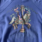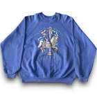 50% cotton 50% poly | USA made 🇺🇸 Vintage 80s 90s ‘tultex’ whimsical fantasy pullover crewneck Christmas sweatshirt in solid blue featuring sparkle glitter unicorn horse pony carousel graphic print on front with long sleeves in size large. Minor piling, with minor signs of wear on graphic adding to its retro appeal, overall in great pre owned condition. Laid flat: chest 21.5” length 23” sleeves 27”