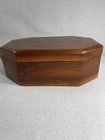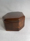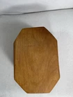 This vintage handcrafted solid wood octagon shaped jewelry/trinket box is a unique and charming addition to any collection. Signed by the maker, this box features a beautiful wood grain pattern in a rich brown color. With dimensions of 9" in length, 3" in height, and 6" in width, this trinket box is perfect for storing small treasures or jewelry. Handmade in the United States during the 1980s, this original piece is a testament to the craftsmanship and attention to detail of that era. The item weighs 2.3 lbs . Excellent preowned condition.