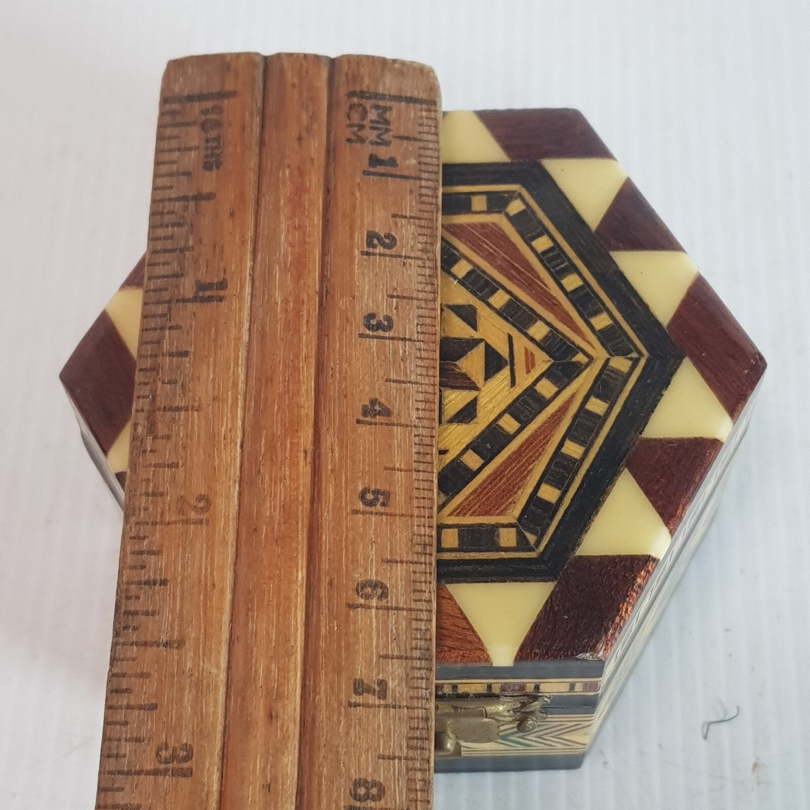 A really lovely inlaid trinket box. Perfect for rings or jewelery.