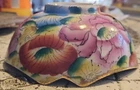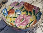 This vintage porcelain bowl is hand-painted with a vintage floral pattern and gold trim, making it a stylish and elegant piece. Made in China in 1940, it features a round shape with a glossy finish, measuring 6 inches in width and 2 inches in depth. This art pottery bowl is for decoration only and showcases an Asian style, perfect for display. The vibrant multicolor floral design adds a touch of charm to this timeless piece. Very colorful. Beautiful. No chips or damage. Very nice for trinkets. See pictures. Needs cleaned.