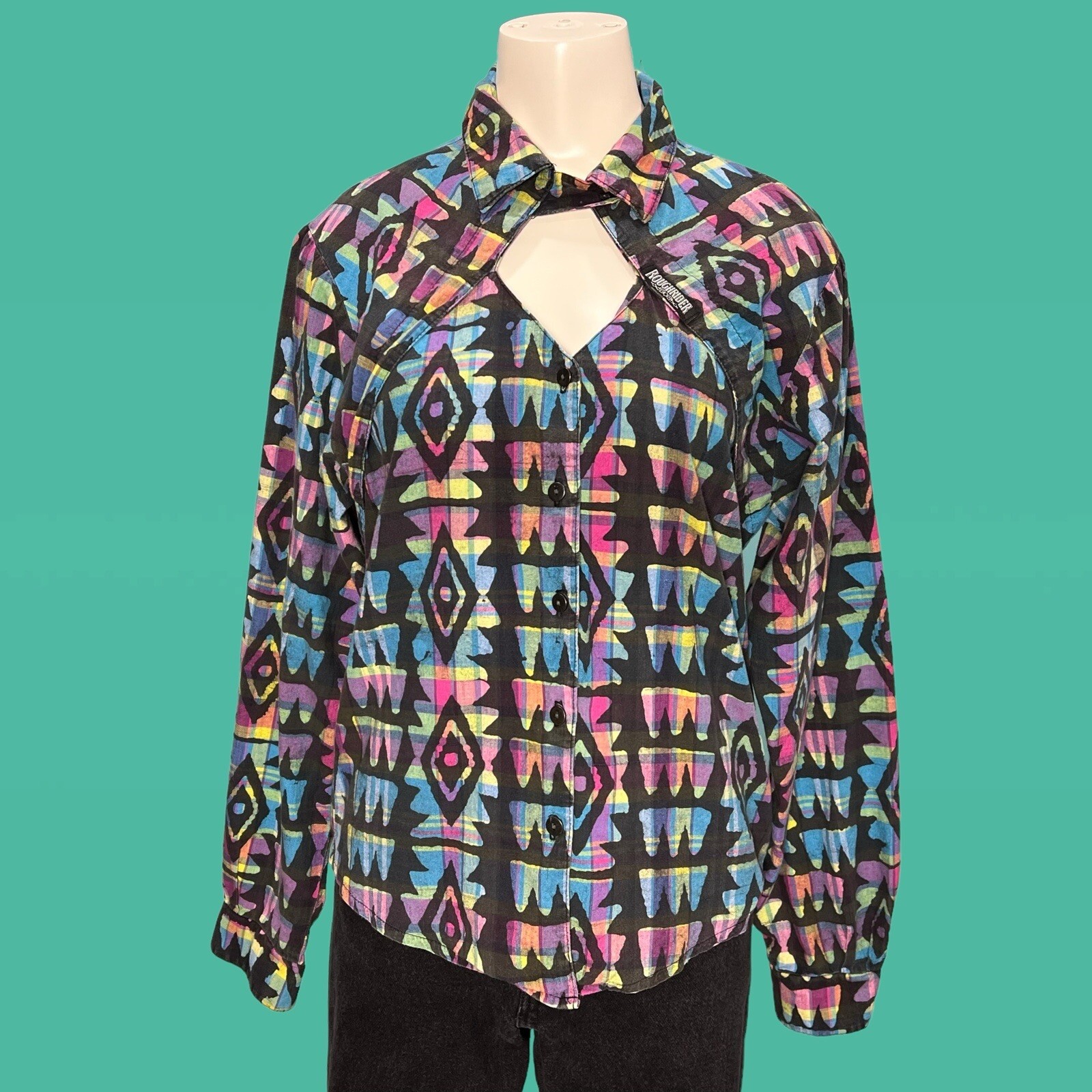 RoughRider By Circle T Plaid Western Rodeo Cowgirl Peek a boo Button Down Size 3/4 Measurements laying flat: Shoulder to shoulder: 16” Bust: 18” Sleeve length: 23” Shoulder to hem: 22” #R55