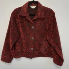 Vintage Touch of Blue floral tapestry button-up jacket - women's size Medium. Deep red and black floral long sleeve. Semi-cropped boxy cut. Beautiful silver floral buttons. Made in USA. Made from a blend of acrylic, polyester, and cotton material. Made in the USA. Measurements in photos. Please review as vintage clothing can differ from today's sizes. Good used condition. No holes or stains. There is a light spot of wear on the front edge between 2 of the buttons, shown in photos. Please see the photos for more condition and item details.