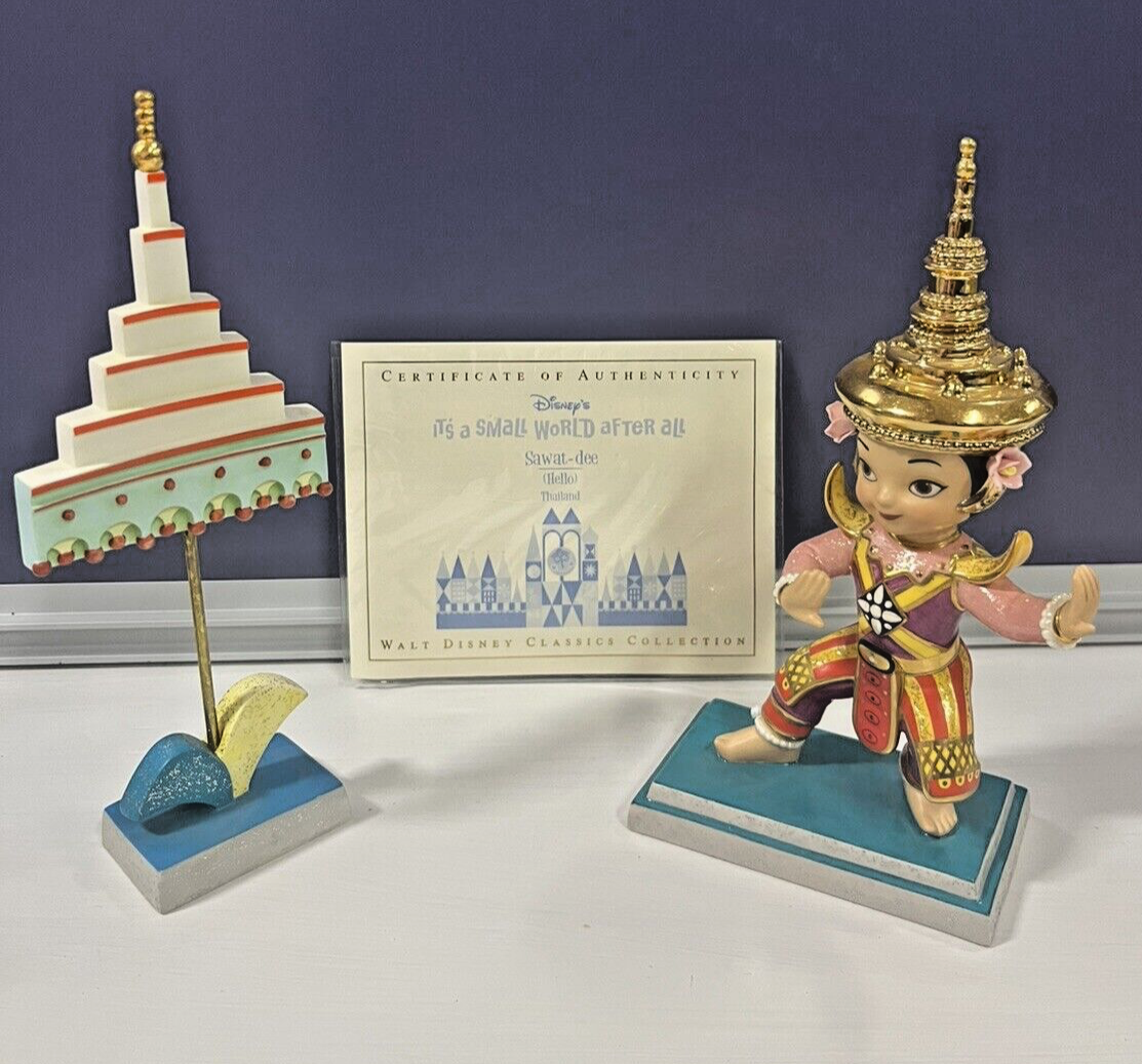 The product is a WDCC Disney Classic figurine from the "It's a Small World" collection, featuring the Thailand Sawat Dee design. It comes with a Certificate of Authenticity (COA) and is part of the Disney franchise. Please note that I am not a professional, so the condition stated is my opinion which can be different then the next persons. Please see all the photos to determine visual condition for yourself as well. If you have any questions, please don’t hesitate to ask. All antique/vintage items may have signs of wear, shelf dust, odor, an aged patina and/or needed repair, etc. I do my best to note and photograph and damages I see on every item listed. All items are sold as found; I leave it up to the buyer to make any repairs or cleaning. All items are sold AS IS. Thank you for looking!