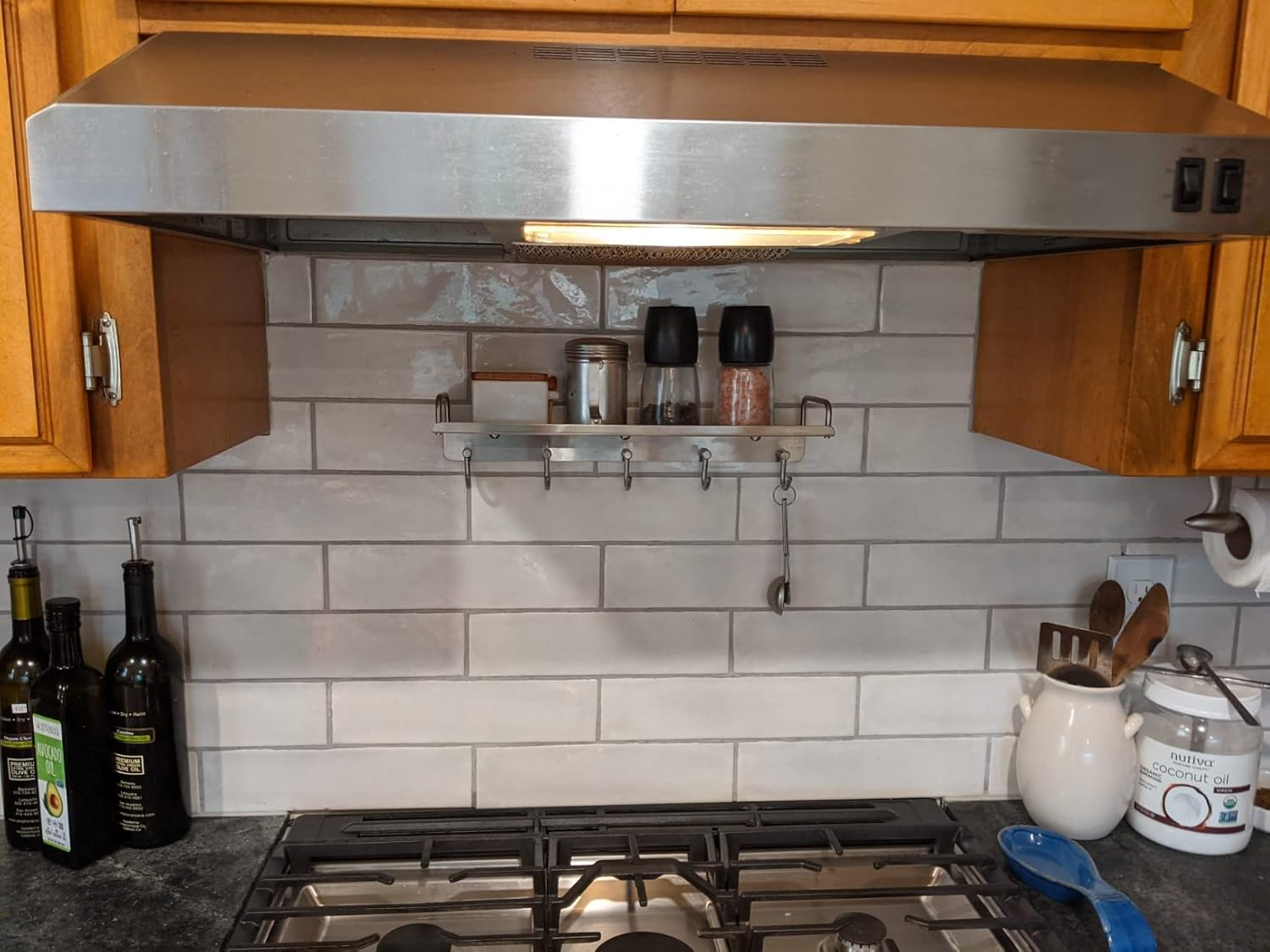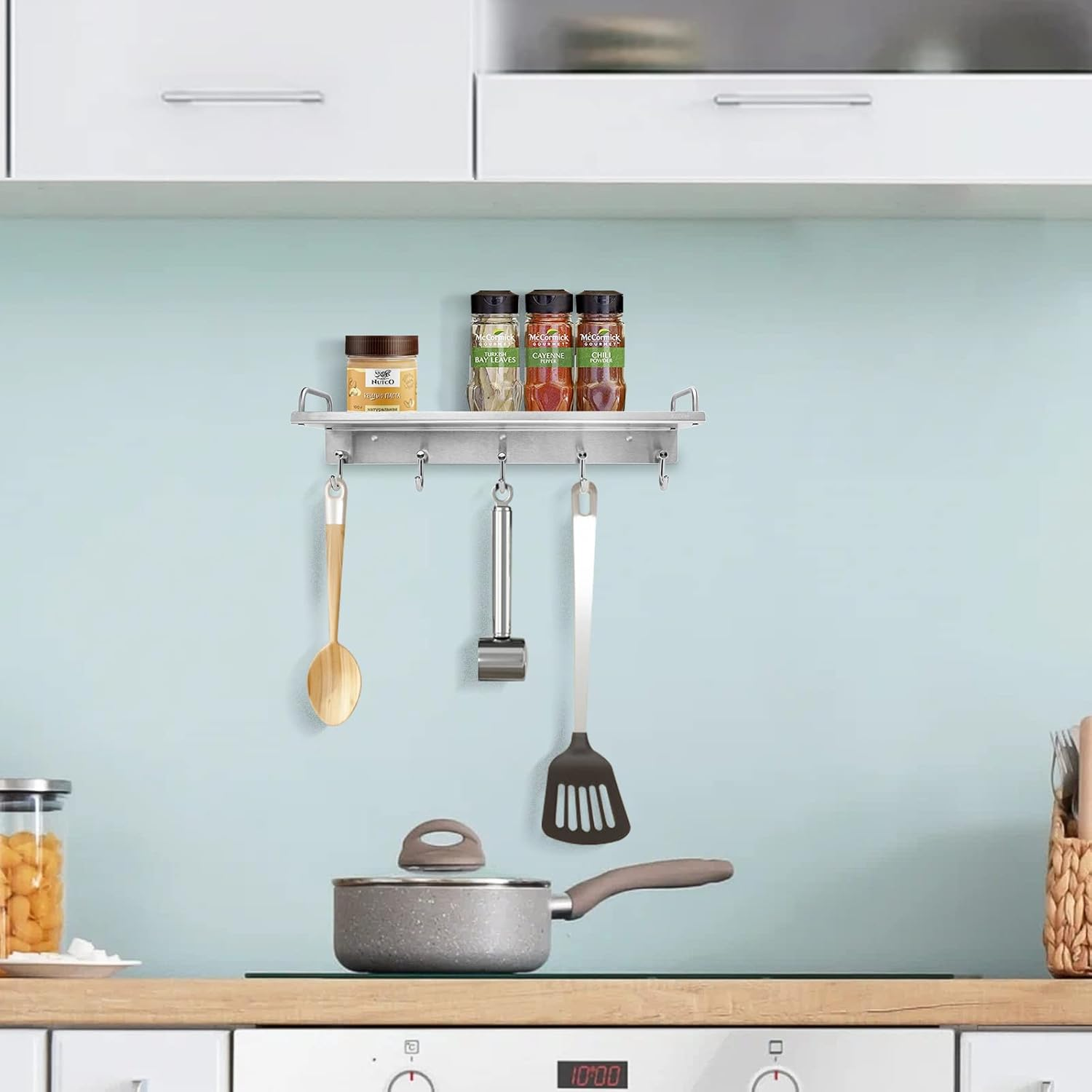 Kitchen Utensil Rack, Spice Rack with Hooks Wall Mount, Over the Stove Shelf, Stainless Steel, Hanging Storage Wall Shelf for Spatula Spoon, Seasoning Jar Organizer CREATE OPEN STORAGE SPACE: Mounted the utensil racks on the wall near the gas range, so you can clear access to the cooking utensils and spices you common need at your fingertips, rather than look for them through the counter or drawers. (NOTE: The overall size of the shelf is 15.75”x4.55”x4.15”, make sure it fits your needs before purchasing) MULTI-FUNCTIONAL STORAGE SHELF:Constructed with a storage shelf and 5 hooks, the wall-mounted shelf is perfect to hold different items like kitchen spices jars, cans, bottles, or bathroom essentials like shampoo, shower gel, and towels. 5 hooks under the shelf are ideal for hanging pans, spatulas, coffee mugs, rags, brushes, etc. SAFTY & STURDY: Made of Heavy Duty 304 stainless steel, ensures sturdiness and longevity, is waterproof and rustproof, and won't get scratched easily. The brushed surface of the rack always looks brand new and makes the cleaning much easier. EASY TO INSTALL: Comes with mounting accessories, simply mark the installation positions, and fix the utensil rack onto the flat wall or board by drilling. (Warm Notes: Product is assembled with screws, if loose, just tighten them with a screwdriver.) PACKAGE INCLUDED:1 Piece Spice Rack with 5 Hooks, 3 sets of plastic anchors and tapping screws. Product Description Use the kitchen utensil rack to put your daily items within your reach instead of looking for them in the cabinet Please kindly notice that the size of the rack is 15.75”x4.55”x4.15” PRODUCT DETAILS Made of 304 stainless steel, the brushed finish design makes the shelf look sleek and simple. I t only requires 3 screws for installation. The rack has 5 hooks, which are sturdy and easy to organize the kitchen utensils Anti-drop design to prevent the items from falling. If you have limited cabinet space, this rack can be hung on the wall or corner as an ideal space-saving solution. WIDE APPLICATIONS Included Components Hardware Room Type Kitchen, Bathroom, Living Room, Bedroom Is Customizable No Assembly Required Yes Shelf Type Sliding Shelf Color Silver Special Feature Rust Resistant Product Dimensions 4.55"D x 15.75"W x 4.15"H Material Stainless Steel Country of Origin China Style Heavy Duty Item Weight 1.92 pounds Number of Shelves 1 Mounting Type Wall Mount Recommended Uses For Product Cookware, Towels Finish Type Brushed Size 15.75 inch 15.75 "h x 4.55 "h x 4.15 "h. Weight: 1.92 lb Shipping from the USA All of our products are shipped from the USA, ensuring quick delivery to your destination. Payment We offer the following payment methods: PayPal, credit card, bank transfer, and eBay's secure payment system. Free Shipping & Free Returns Shipping within the USA is FREE. Additionally, any return is absolutely free for you. Risk-Free Purchase You have the option to return an item within 30 days without any justification. We cover the return shipping costs! Fast Shipping We ship immediately upon receipt of payment. Generally, the package is delivered within 2-3 days in the USA. If it takes longer, we will contact you. Quality and Costs Made in Europe, USA, China No customs fees or additional charges Total satisfaction guarantee Invoice with declared VAT available upon request in .pdf format Feedback Your feedback is very important to us. After you pay for your purchase, you will automatically receive positive feedback from us.