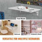 VEVOR Wall Mounted Folding Table – Space-Saving Style for Every Room This wall mounted folding table effortlessly complements any tool room with its easy-matching design. It's both practical and stylish, maximizing space and providing excellent storage solutions. Designed with a spacious surface, this wall mounted desk meets diverse living and working needs. Whether as a desk or workstation, it comfortably accommodates decorations, books, laptops, and tools, keeping everything neatly organized. Crafted from premium materials and meeting stringent environmental standards, our wall desk ensures a safe environment for your family, especially children. Its sturdy construction with dual-sided decorative layers and a robust core board enhances durability and aesthetics. Our floating desk is easy to set up with precise positioning paper included. No need for complex tools or measurements—just stick the paper and install hassle-free, reducing setup errors. Ideal for creating functional storage without taking up floor space. This wall mount desk fits seamlessly into various living spaces, organizing bathroom essentials, displaying cosmetics, or serving as a convenient bedroom desk.