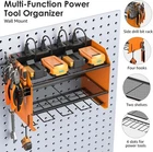 Set Power Tool Organizer Wall Mount with Charging Station. Garage 4 Drill Storage Shelf with Hooks, Heavy Duty Metal Tool Battery Charger Organizer. Shop Utility Rack with Power Strip Orange. Wall mount power tools organizer come with 4 slots, 4 hooks and drill bit rack, built-in power strip, double layer structure can keep rechargeable tools organized in the work area and save your bench space. The tools in the picture are for demonstration purposes only and are not included. Power tool organizer with charging station, come with 8 outlets. If you have a lot of rechargeable tools, you can charge everything right in the rack and avoid searching for sockets. 6ft power cord included. Very convenient for charging your tool batteries, All-in-one design and the metal power strip with surge protection of 1200J, Able to protect your device to a certain extent. Utility rack size: * * H:12in. Add a tool box on the side to store multiple types of gadgets - Commonly used drill bits, tweezers, screwdrivers, also equipped with four hooks to hang tools such as tape measures or wrenches. to increase the diversity of storage. Easy to assemble and mount on a peg board, If you need more storage space, you can connect the two shelves (or more) by screws. Each layer of the grid can support a maximum weight of 33IB. Made from heavy gauge steel.