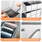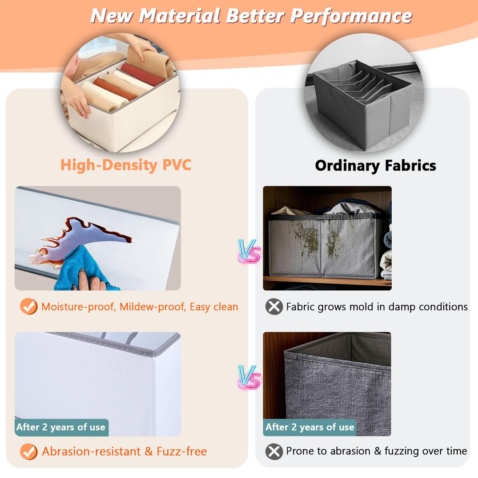 LARGER SIZE, MORE WIDELY USE: Our 7 grids clothing storage bins is larger than other 7 grids clothing box, better compatibility. Our wardrobe storage bins is perfect for storing jeans & trousers , shirts, leggings, thin sweater, towel, kids clothing or other items. Especially large size jeans & pants can also be stored well, other 7 grid clothing organizer does't fit large size jeans & trousers, this is a big difference between our 7 grid wardrobe organiser and others 7 grids UPGRADE MATERIALS AND DESIGN: Our baskets for closet organization made of PVC mesh + PP plastic board. Compared to ordinary nylon mesh, we are build-in premium PP plastic board, upgraded materials and design strengthens the support of the clothes drawer organiser and improve the deformation, collapse and other problems when using, easier to use. Washable, odorless, no harmful, easy to clean, sturdy and durabl NEW ORGANIZER INNOVATION: Dividers organiser for clothes is a great concept for closet organisers and storage, 1 clothing 1 grid, convenient and neat, this 7 grids clothes storage organizer can helped organize your closet mess, It's perfect pants organizer for closet. Visible compartment organise, easy to find, pick up and put in your clothing, save your time and space. The closet organizers and storage bins is a great choice for clothing organization INCREASED SPACE UTILISATION: Foldable and stackable storage bins for clothes is great for small homes and space, greatly improve the utilization rate of your room space. Clothes compartment organizer is suitable for storage in drawer, closet, wardrobe, bedroom, dresser tables, underbed, dorm, etc. With this drawer organizers for clothing, need not worry about not having a place to store your clothes SAVE SPACE AND TIME: This clothes organizer can solve most of the daily clothes storage problems and keep your living space organized, make it easier for you to organize and store clothes at home, reduce your workload, and save time spent on organizing clothes