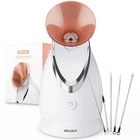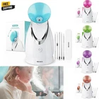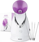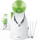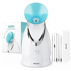 Facial Steamer Ionic Face Steamer for Home Facial With Stainless Steel Skin Kit Upgraded Ionic Steam Tech : Facial Steamer is a new type of steamer that generates ionic steam. Steam combined with ionic water particles are up to 10x more effective in penetrating skin than basic hot water steamers. This high powered tech is designed to be used with distilled or purified water for best results. After filling with specified water and turning it on, enjoy strong and soothing mist within 30 seconds. Relax and enjoy the flow of steam for approximately 10 minutes. At Home Facial Steamer & Enjoyable Fragrance : The facial steamer helps to moisturize your skin and unclogs pores to allow better penetration. The direction of the nozzle and steam flow is adjustable to create your perfect relaxing at home facial. Moreover, if you need aromatherapy, you can drop a few drops of essential oil onto the aromatherapy pads and place them on the machine's built-in aromatherapy tablets. Safety : The facial steamer is made of eco-friendly ABS, non-toxic, and non-irritating material. When using for the first time, you may notice a slight new plastic smell as is normal with all plastic products. Worry not as this smell will disappear after a few uses. The face steamer steamer will also power itself off when the water supply has run out to prevent dry burning. Professional 5 Piece Skin Kit Included : 5 Piece Skin Kit is included with every facial steamer. You can follow up your steaming session by using this kit to remove blackheads and blemishes effortlessly for perfect skin after every use. Great Gift & Tip : The facial steamer comes equipped with exquisite gift-ready packaging that makes it become a perfect Birthday gift, Halloween gift, Christmas gift, valentines day gift. Note: Distilled water or pure water can only be added to the water tank. DO NOT add other liquids such as aromatherapy essential oil, otherwise it will cause the water tank to rupture.