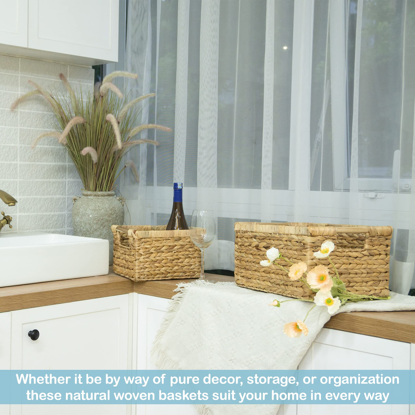 ✅ Wicker Storage Baskets - Whether it be by way of pure decor, storage, or organization for kitchen, pantry, or bathroom, these natural woven baskets suit your home in every way. The basket is great for magazines, games, pet toys, media, household items. ✅ Natural & High Quality - Our wicker baskets for shelves are made of Water Hyacinth, a natural material with an iron frame for sturdy and durable storage. The nice wooden handles on both sides are to help you easily carry the wicker baskets. ✅ Decorative Wicker Baskets - natural Water Hyacinth baskets are an easy and affordable way to change the style of your home. With their natural design, these baskets wicker make nice neutral backdrops and can brighten your day as well as impress your guests. ✅ Set of Three - (Large) 14.5"L x 10.3"W x 7.5"H, (Medium) 12.2"L x 8.9"W x 6.9"H, (Small) 10"L x 7.5"W x 6.3"H. These wicker baskets can stack inside of each other allowing for convenient and easy storage when not in use and are convenient storage bins for drawers, shelves, desks, or anywhere in the house. Please kindly make allowances for slight variations due to the handcrafted nature of these goods. Just use a damp cloth and wipe it gently for cleaning. ✅ Ideal For Home - Wicker basket with handle is an easy and affordable way to change the style of your home, and is a great way to make a difference by promoting a sustainable lifestyle. With it's natural design, the basket storage wicker make nice neutral backdrops and can brighten your day as well as impress your guests.