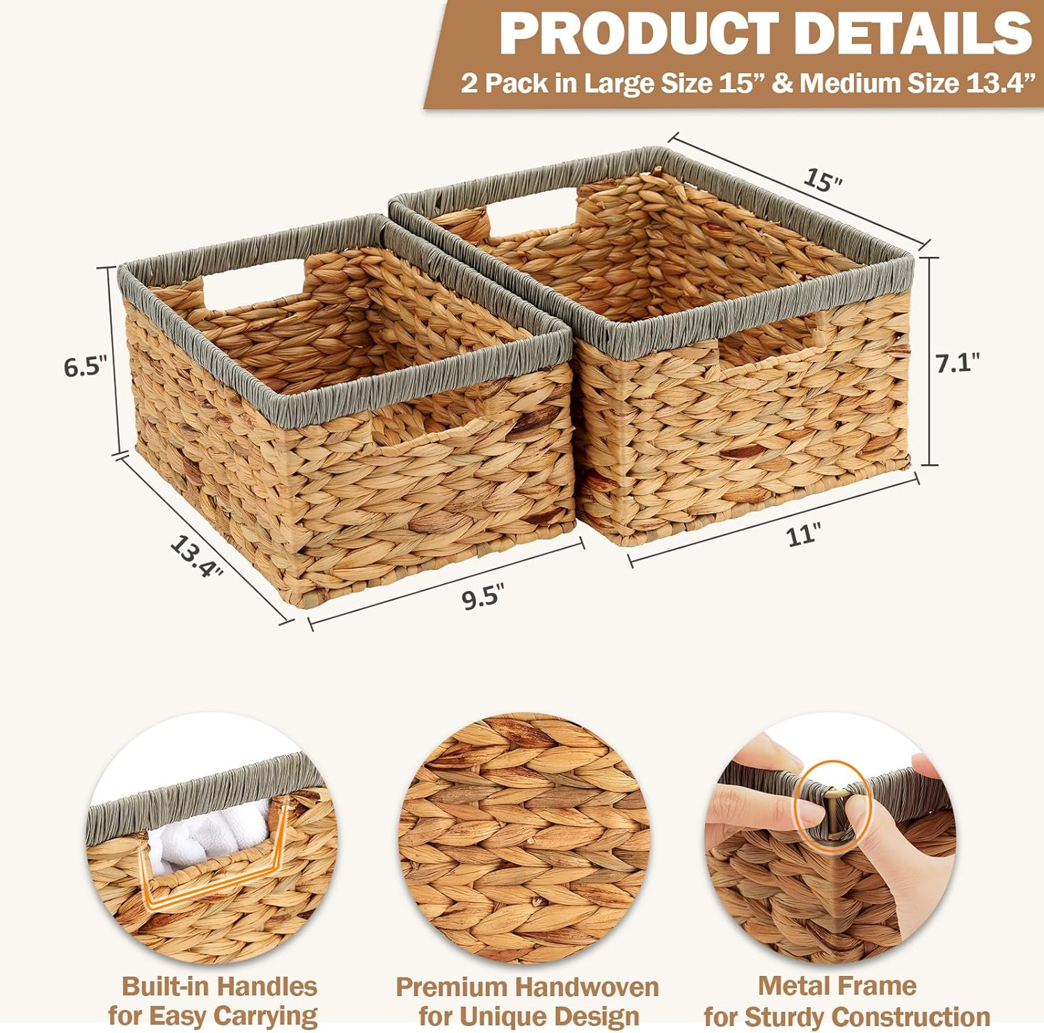 Store New Arrivals Add to Favorite View Feedback Contact Wicker Baskets for Storage, Water Hyacinth Storage Baskets with Built-In Handles, Wicker Storage Baskets for Shelves, Large Wicker Baskets for Organizing 2 Pack, Natural with Grey, Size L & M Description Closure Type Open Top Style Modern Finish Unfinished With Lid No Color Natural with grey Finish Type Unfinished Product Dimensions 11"D x 15"W x 7.1"H Material Water Hyacinth Batteries Required? No Room Type Living Room Item Weight 3.43 pounds Shape Round Batteries Included? No Recommended Uses For Product Storage Special Features Sturdy Special Feature Sturdy Handle Material Water Hyacinth Size Large+Medium Number of Pieces 2 Natural Wicker Basket: Made of natural water hyacinth, the wicker storage basket is sustainable and renewable. Natural water hyacinth combined with grey accents provides a stylish and modern look, adding a touch of elegance to your space. Versatile Use Wicker Baskets for Storage: The wicker basket can be used in multiple areas of your home, such as living rooms, bedrooms, bathrooms, and kitchens. The wicker storage baskets are ideal for organizing toys, books, clothes, towels, and other household items. Durable Wicker Basket with Handle: The wicker storage basket is equipped with strong and heavy duty built-in handles, make the water hyacinth storage baskets easy to carry and move the baskets around, providing convenience and ease of use. Sturdy Water Hyacinth Basket: Equipped with solid metal frame and good-quality weaving, makes wicker basket durable and long-lasting without losing shape. And items stored in wicker storage baskets are easily accessible due to open-top design. Large Wicker Baskets for Storage: 2 pack wicker baskets for organizing in size large 15"x11"x7.1" & medium 13.4"x9.5"x6.5", offer ample storage space for various items, help to keep your home tidy and organized. Say goodbye to cluttered and messy life. Product Description Edergoo Water Hyacinth Storage Baskets-Keep Home Organized Wicker Baskets for Storage Wicker Storage Baskets for Shelves Natural Water Hyacinth Basket The wicker storage basket is made of water hyacinth, it is naturally sun-dried without any coating and woven into a water hyacinth storage baskets directly, which is sustainable and renewable. Supports sustainable living by opting for Edergoo wicker baskets. Heavy Duty & Large Capacity Wicker Baskets for Organizing Large capacity 2 pack wicker baskets in large size 15"x11"x7.1" & medium size 13.4"x9.5"x6.5", nesting design for compact storage when not in use Built-in handles makes carrying the wicker storage basket easily Equipped with solid metal frame and good-quality weaving, makes wicker basket durable and long-lasting without losing shape Crafted with utmost care by skilled artisans, each wicker storage basket is a unique handicraft, add a touch of natural elegance to your home decor Versatile Wicker Baskets for Storage Versatile use wicker basket with handle are ideal for organizing toys, books, clothes, towels, and other household items Multifunctional Use Large Wicker Storage Basket The wicker basket can be used in multiple areas of your home, such as living rooms, bedrooms, bathrooms, kitchens, shelves, office ABOUT US We offer the best prices around on high quality products. Our E-store includes media such as books, movies, music and games while offering electronics, toys, sporting apparel, clothing, tools, general home, garden items and more. SHIPPING We are always working hard to ensure your package arrives as soon as possible. Please understand that some factors like weather, high postal traffic, and the performance of shipping companies are outside of our control. We offer free shipping to the lower 48 states and ship within 2 business days of payment, usually sooner. We do not accept P.O. Boxes. Please provide a physical address. For shipping outside of the continental USA, we only use eBay's Global Shipping Program.The item is shipped to KY and then sent to the rest of the world. International customers are responsible for all duties and taxes. Continue to check out in order to calculate costs for shipping the item to your country. Messages regarding eBay's Global Shipping Program MUST be directed at eBay EXCLUSIVELY. RETURNS We offer a 30-Day Return Policy on items which you are not completely satisfied with. You have the option for a full-refund or an exchange of the item. No returns are available on items shipped outside of the USA. PAYMENT We accept PayPal. CONTACT US This page content is yet to come Please ad us to your favorite seller and visit again later Thank You CUSTOMER SATISFACTION We try our very best to make sure every customer is completely satisfied. If there's a problem, message us! We're happy to help. WE ACCEPT Copyright © 2021 AutoDS. | All Rights Reserved