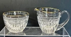 Waterford Marquis Clear Glass Gold Trim Creamer and Open Sugar Bowl Set Signed. Pre-owned item in great condition, has some wear as you'd expect from a used item. No cracks or chips noted. Elegant table presentation.Please use the zoom feature to determine shape and condition, check all pictures and measurements carefully for detailed viewing as they are part of the description and help you with your purchase. I invite you to always check my new listings, buy with confidence. Smoke free home. Thank you, have a wonderful day!! W - 82