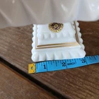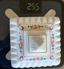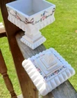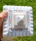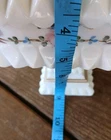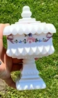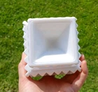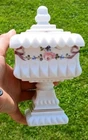 This elegant Westmoreland USA pedestal covered Milk Glass Dish is a beautiful addition to any collection. The square shape and glossy finish make it a perfect choice for a wedding occasion or home decor. The bowl is handmade and features a floral pattern, with gold painted trim and hand painted details. The Westmoreland USA Milk Glass Covered Dish is an original piece from the early 1990s, with a pressed glass production style and a weight of 2lbs and 5.5 oz. It is a perfect gift for adults, with a custom bundle that includes a pedistal bowl and lid. The item width is 4.5 inches, and the item depth is 3.5 inches. Condition: Preowned/Preloved Item, Excellent condition, has minor red staining inside the dish in the corners from previous owner using it, normal minor wear, not abused, cleaned/sanitized, free of odors. please see photos for further details before purchasing. Thank you 😊 Shipped with ground shipping boxed and packaged with care. Items weight is approximately 2 1/2 pounds +box +wrapping and bubble wrap will be approximately a 4 lb package. Shipping cost is estimated.