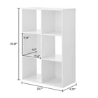 Product details The 6-Cube Storage Organizer features six compartments perfectly sized for storing and displaying office supplies, books, clothes, craft supplies, photos, collectibles and so much more! This sturdy bookcase can stand vertically or horizontally to best suit your needs and space. They are compatible with 10.5" x 10.5" collapsible storage bins (sold separately) and available in multiple finishes. Three open-back cube shelves make managing cords and cables easy, while three closed-back shelves help keep items securely housed. Add an accent piece that is both functional and stylish to your living room, family room, home office, playroom, closet and more, with the 6-Cube Storage Organizer. Stylish 6-cube organizer bookcase Features six 11" x 11" x 11" open storage compartments Can be used vertically or horizontally to fit your space and needs Designed with 3 open-back shelves and 3 closed-back cube shelves Top panel and 2 middle shelves support up to 22 lbs each; bottom panel supports up to 33 lbs Compatible with 10.5" x 10.5" collapsible storage bins (sold separately) Perfect for use in dens, living rooms, family rooms, playrooms, home offices and more Materials: particle board, paperboard Finishes available: White (MS5336278612010), Black (MS5336278612009), Canyon Walnut (MS18-D1-1009-49) and Rustic Brown (MS18-D1-1009-48) Attaches to the wall with included hardware for safety Easy to assemble with included instructions and assembly video guide (hammer & Phillips head screwdriver required) Package size: 39.53" x 4.17" x 15.28" (32.81 lbs) Assembled weight: 32.5 lbs Assembled dimensions: 23.7" W x 11.73" D x 35.39" H