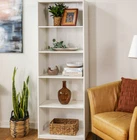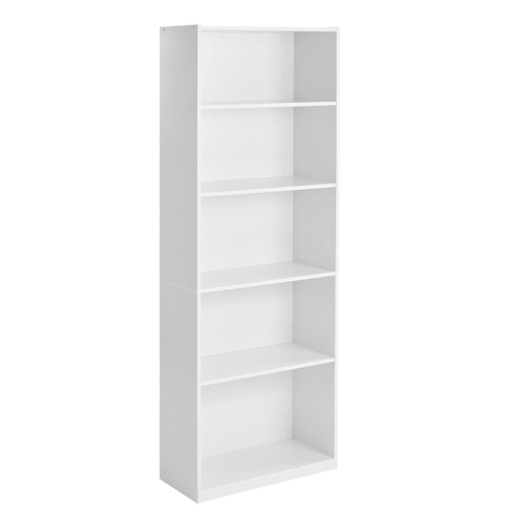 Product details Add 5-Shelf Bookcase with Adjustable Shelves to almost any room for a functional and stylish look. This sturdy storage unit has a closed-back design with 2 fixed shelves that hold up to 50 lbs each, and 3 adjustable shelves that support up to 35 lbs each. This attractive bookcase provides a useful storage option for any office, living room, family room, den and more. For safety, this bookcases secures to the wall with an included wall strap kit. The 5-Shelf Bookcase stands 71" tall making it perfect for large rooms where smart, efficient storage is needed. The adjustable shelves accommodate everything from paperbacks to large folios to deliver a functional bookcase ideal for a variety of libraries and collections. Traditional 5-shelf bookcase with 3 adjustable shelves and 2 fixed shelves Sleek and sturdy closed back design adds flexible storage and sophistication anywhere in your home Sleek solid White finish Fixed shelves support up to 50 lbs each; adjustable shelves support up to 35 lbs each Perfect for books, important papers and files, photography, small artwork, collectibles and more Attaches to the wall with included safety strap kit Materials: particle board, MDF Finishes available: White (MS5336278612006), True Black Oak (MS5336278612004), Espresso (MS5336278612005), Canyon Walnut (MS19-D1-1009-24) and Rustic Oak (MS19-D1-1009-23) Easy to assemble with included instructions and video assembly guide (hammer, Phillips head screwdriver & flat head screwdriver required) Package size: 43.9" x 6.69" x 14.29" (55.66 lbs) Assembled weight: 49.94 lbs Assembled dimensions: 24.88" W x 11.65" D x 71.42" H