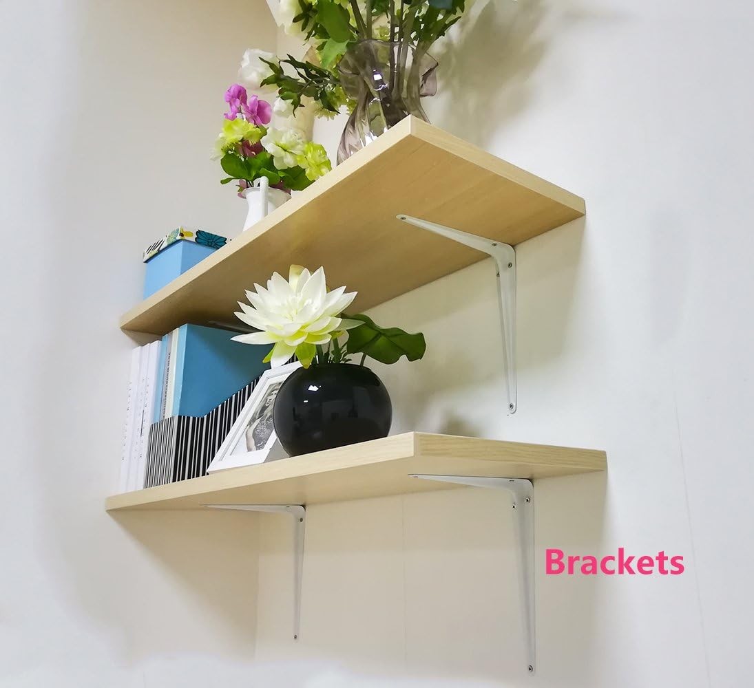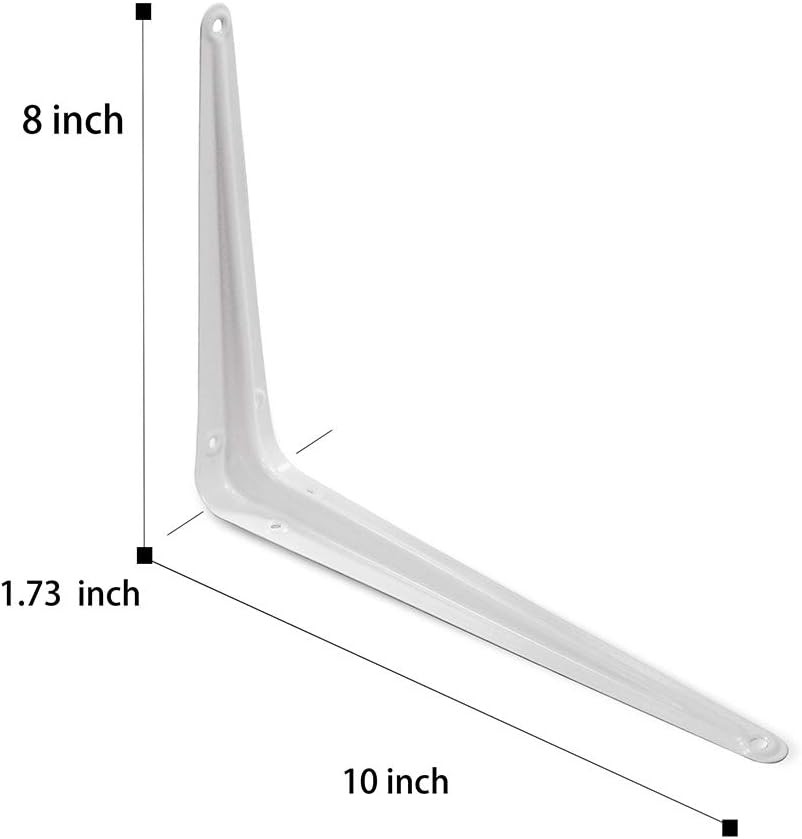 8 x 10 inches shelf brackets: steel shelf brackets in white color. Convenient for use, suitable for home, garage, workshop, office shelves, etc… Very easy to install and they holds the shelves very securely. Package Includes: 10 PCS x wall white shelf brackets Color: Powder Coated White; Material: Steel Shelf Brackets Can be Used as a Shelf Support or Brace Bracket Holds the Shelf Securely; Durable: Holds Up to 152 lbs Shelf Bracket Size: 8 x 10 inches Easy to Install; Suitable for Home, Garage, Workshop, Stores, Office Shelves etc..