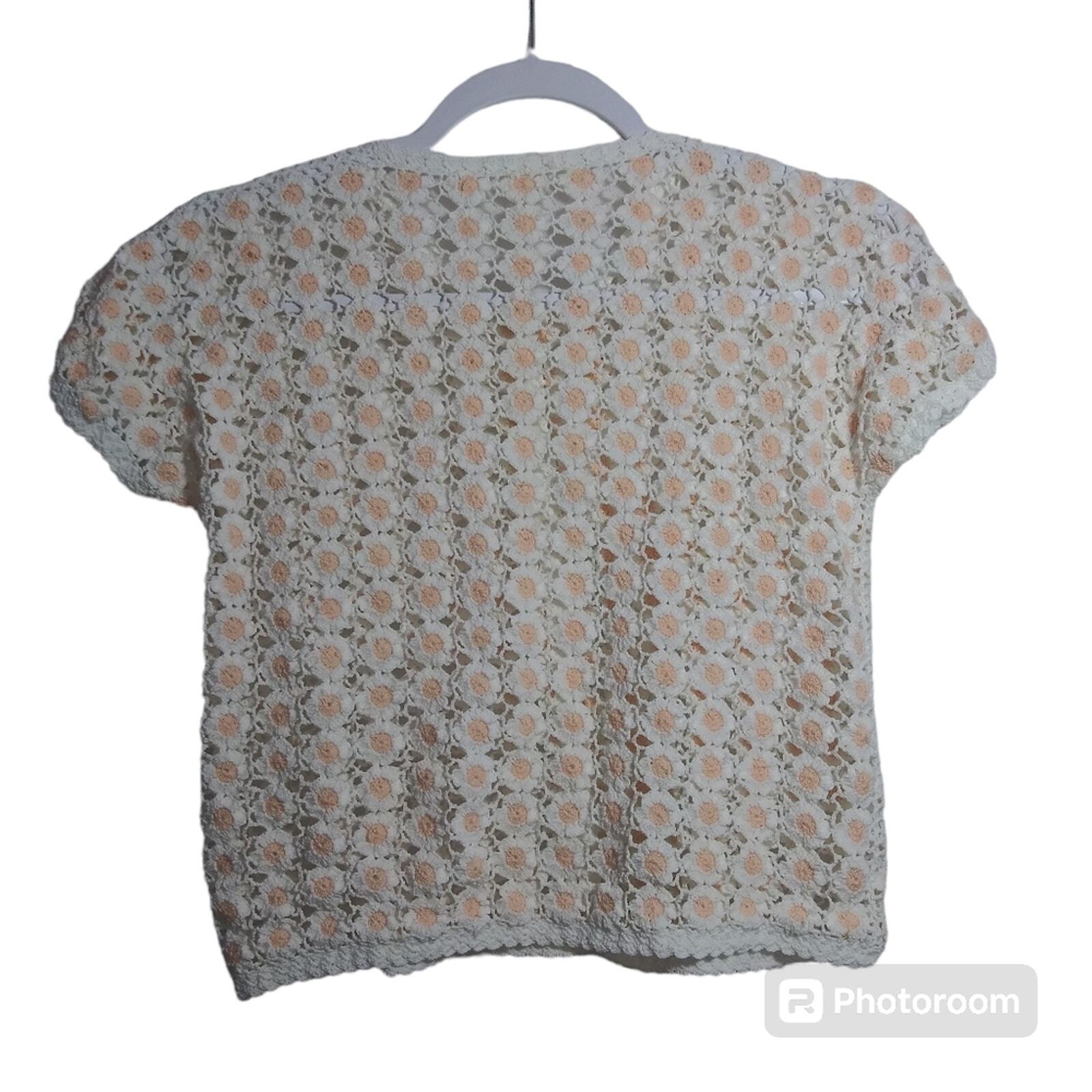 White Floral Crochet Button Front Cardigan Size Small Short sleeve Crochet Pearl oversized buttons Short Sleeve Gently worn no size tag see measurements please take note of the small stain on front approximate measurements pit to pit 16" length 17"