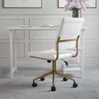 The Ivy Armless Office Chair pairs traditional design with clean lines to instantly update your work space. This faux leather desk chair features a polished brass frame that adds elevated sophistication to a classic look. A pneumatic height adjustment lever tucked beneath the 360 swivel seat offers a custom seating experience to keep you comfortable throughout your workday. Assembly is easy with the included tools and step-by-step instructions. The Ivy Office Chair introduces linear elegance to your work space This chic desk chair is upholstered in white faux leather with polished brass frame and features a sleek armless design 360° Swivel seat with pneumatic height adjustment, tilt lock, tilt tension, and built-in lumbar support provides a custom seating experience Assembly and Care Instructions: Quick and easy assembly with included tools and wipes clean with damp cloth Dimensions - 19"W x 21.25"D x 37.5"H; Seat Size: 19"W x 18"D x 21.5"H; Back Size: 17.75"W x 17.75"H; Maximum Static Weight Capacity: 300LBS