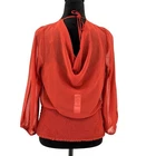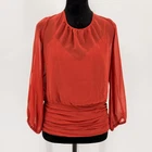 In the land of fashion wonders, this White House Black Market blouse weaves a tale of sophistication with its flowing red ochre hue. The lightweight polyester fabric, combined with the elegant draping details, offers a timeless charm. A wardrobe staple for those who appreciate elegance in simplicity. • Red Ochre Color • 100% Polyester • Long Sleeves • Ruched Waist • Keyhole Back • Round Neckline Bust = 17 1/4 inches, Waist = 16 1/4 inches, Length = 22 3/4 inches, Sleeve Length = 18 1/2 inches.