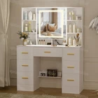 White Vanity Makeup Table with LED Lighted Mirror and 7 Drawers & 6 Shelves FEATURES [Lighting & Brightness Adjustable]: LED light with 3 different settings: warm yellow, warm white and cold white, make this vanity dresser more beautiful. Touch the switch, you can easy to change the color mode, or adjust the brightness by press and hold the switch. [Multiple Storage Space]: This large makeup vanity will be your perfect choice to say goodbye to clutter. The spacious tempering glass table top,The vanity set contains 7 drawers, 6 shelves, making everything look organized. [Stylish and Refinement Design]: This vanity is not only a makeup table, but can also be used as a computer desk, writing desk, night light, or bedside table. Additionally, it can be placed freely in various locations such as the bedroom, dressing room, hair salon, studio, and live streaming room. It is an extremely thoughtful and romantic gift for occasions such as Valentine's Day, Mother's Day, Christmas, girlfriend's birthday, or housewarming gifts. [Sturdy Structure & High Quality]: Combines with flat boards and sturdy metal frame, ensure the stability and long time use of this cute vanity. [Easy Assembly]: All parts and accessories are labeled and step-by-step instructions are also included, two people are recommended to ensure a quick assembly Specifications: Color: White Material: MDF Vanity Size: (L x W x H): 100 x 40 x 140 cm Mirror Size (L x H): 44.8 x 45.6 cm Package Included: 1 x Dressing Table 1 x Instructions