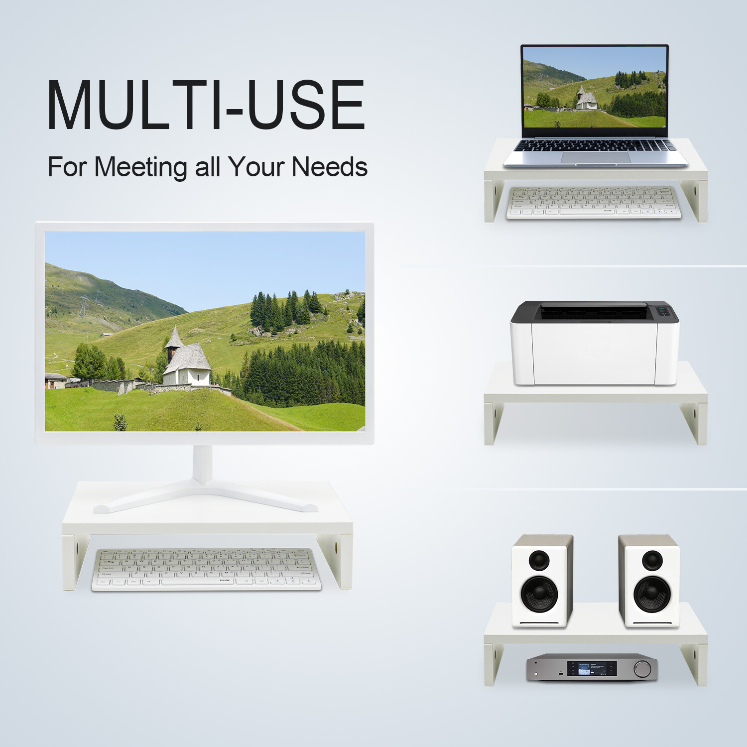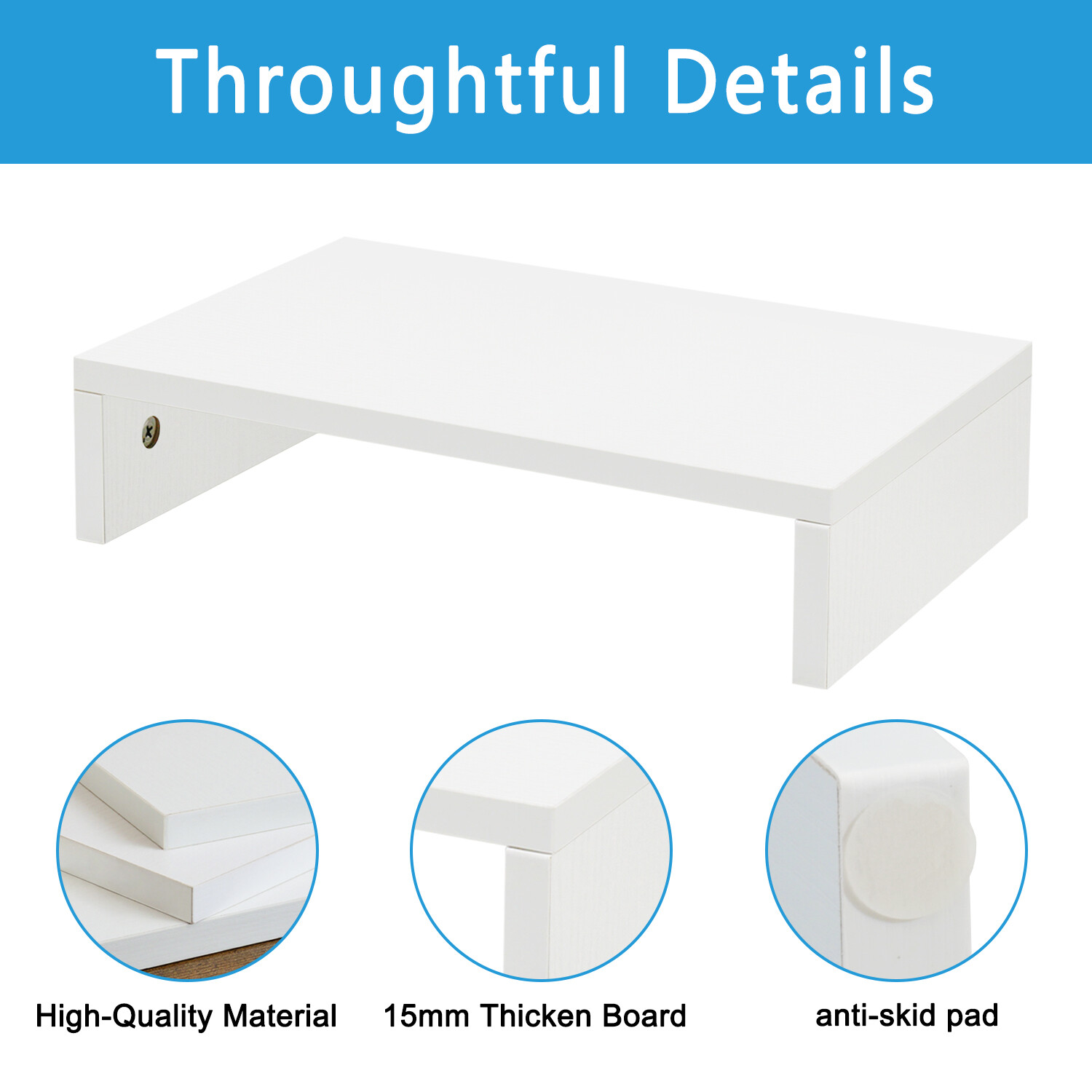 14.2 inch White Monitor Stand Riser, Wood Monitor Riser with Storage for Desk Small Monitor Stand TV/Screen/PC/Laptop Riser Computer Stand Desktop Shelf TEAMIX (White-14.2 inch) The item will be shipped from the USA Warehouse, you can receive soon. Feature: ① Better Support ② Space-Saving ③ Simple Modern Style ④ Multi-function Stand ⑤ Simple Assembly Package including: ① 1pc Monitor Stand Riser (Easy assemble) ② Accessory Bag ③ Installation Instruction Paper Product Details: Size: 14.2*9.5*3.4 inch (L*W*H) Package Size: 16.33*11*1.6inch (L*W*H) N.W.:1.26KG (2.8Ibs) G.W.:1.36KG (3Ibs) Color: White Material: MDF Board Assemble:Follow the steps step by step to assemble, usually an adult can complete it in a few minutes. Notes: ① Prevent children from swallowing screws. ② Please do not tighten the screws too hard, otherwise the board will be deformed. ③ The color of the product may be affected by the screen display. There may be chromatic aberration. Please refer to the actual product.