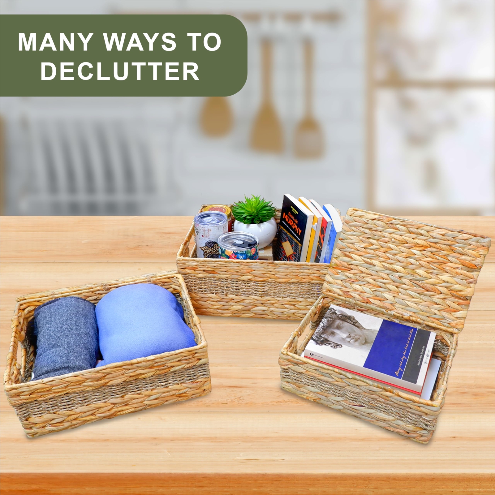 Handcrafted Charm - These water hyacinth basket sets are handwoven, offering a unique, rustic touch to your decor, making each piece a decorative basket with lid, wicker basket with lid, woven storage basket with lid, wicker storage box, rectangle wicker basket, large rectangular basket that's both practical and stylish. Versatile Storage Solution - Keep your home organized with wicker storage baskets with lids, woven baskets for storage with lid, lidded basket, wicker box with lid, woven baskets with lids, hyacinth storage baskets that seamlessly blend functionality with aesthetic appeal, perfect for any room. Durable And Sturdy - Each woven basket with lid, covered baskets with lids for storage, baskets with lids for organizing, large baskets with lids, water hyacinth storage baskets, rectangle baskets for storage is crafted around a robust frame, ensuring they can withstand everyday use while maintaining their shape. Tailored To Taste - Offered in three distinct sizes, these baskets ensure a unified yet flexible storage system that suits any room or requirement. Great used as wicker storage basket with lid, wicker baskets with lids, wicker basket set, storage baskets with lid, rectangular storage basket... Smart Storage - Protect your belongings from dust and maintain neatness with hinged lids that guarantee a secure and tidy closure for each basket. Great used as wicker storage basket with lid large, decorative storage baskets with lids, rectangle wicker storage basket, large rectangle storage basket...
