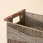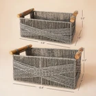 100% RECYCLABLE MATERIAL - Made from recycled paper ropes, wood handles, and built-in iron frames, these storage baskets are designed with a sustainable purpose and are also sturdy to use. MINIMALIST STYLE - Each basket is in a succinct finish of intersecting lines for a touch of whimsy. Meanwhile, the built-in wire construction ensures the stability of the set. The neutral color makes these baskets for organizing matches with any interior style. HANDMADE BASKET - Handmade by skillful craftsmen, this storage basket set is lightweight yet durable. The handles have been delicately carbonized, creating a charming unfinished wood appearance. The distinctive wooden texture adds to the box's overall visual appeal and brings a touch of rustic charm to any living space. VERSATILE STORAGE SOLUTIONS - With iron frames inside to enhance sturdiness, this set is strong enough to hold towels, makeup, books, etc, making it ideal for cluttered spaces like the nursery, living room, bedroom, and home office. PORTABLE - A lovely flexible basket trio, great for carrying around with durable wood handles and a spacious room for storing items. Size:L- 14.6”L×9”W×6.5”H, S- 13”L×7.5”W×5.5”H