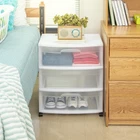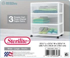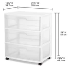 The Sterilite 3 Drawer Wide Cart offers a practical and versatile storage solution for any room of the home! Organize a variety of household items where they are most frequently used - in the bedroom, kitchen / pantry, bathroom, craft room, nursery or dorm room. It can even double as a nightstand, dresser or way to make efficient use of closet space. Neatly store anything from clothing, accessories, and towels to craft supplies, health and beauty items, toys, and more. The drawer design features an integrated handle for easy opening and is clear, allowing contents to be easily identified, while keeping them contained. The drawer stop feature prevents drawers from being removed accidentally. Add the casters to create a rolling storage option, and easily move the Drawer Cart wherever it is needed. It's easy to get organized and keep your living spaces clutter-free with the 3 Drawer Wide Cart! The overall assembled dimensions of this item are 15 1/4" D x 21 7/8" W x 24" H. Outside Dimensions: 15 1/4" x 21 7/8" x 24" Single unit option White Interior Dimensions at bottom of drawer: 19 1/8" x 13 1/4" x 7" Assembled Cart Height, with Casters: 25 5/8" Multi-purpose and versatile storage option for any room of the home Clear drawers allow contents to be easily identified Easy pull out handles with drawer stops to prevent drawers from being removed accidentally Casters are included to create a portable storage solution Weight: 11 lb. / 4.99 kg Cube: 5 cu ft. / 0.142 cu m