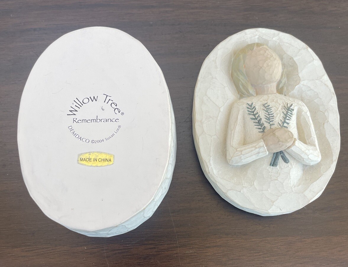 This charming Willow Tree trinket box is a wonderful addition to any collection. Crafted in an elegant oval shape, this decorative piece is perfect for storing small keepsakes and trinkets. Made in 2004, it is a great way to remember a special year or occasion. The box features delicate and intricate details, making it a lovely display item as well. Ideal for collectors of decorative boxes, this Willow Tree trinket box is a must-have.