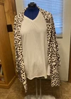 This beautiful LuLaRoe cardigan is a must-have for any fashion-forward woman. The multicolor animal print pattern is eye-catching and unique, making it perfect for any occasion. The long sleeves and knit fabric make it comfortable and perfect for cooler weather, while the button accents add a touch of sophistication. It is made of a combination of polyester and spandex, making it durable and stretchy. This cardigan is perfect for women of size XL and regular size type. Whether you're dressing it up or down, this sweater is sure to make a statement. Under shirt is large