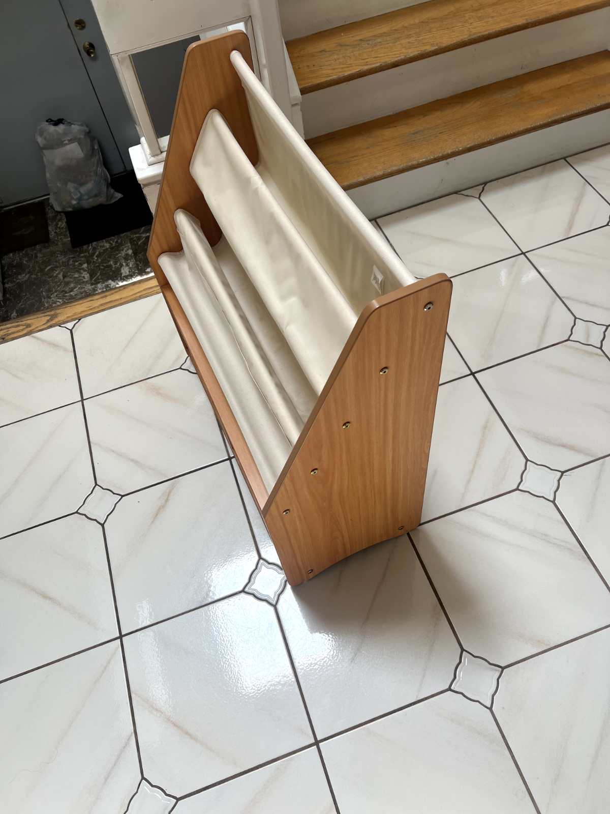 Gently used, this stylish and functional wooden book rack is perfect for organizing children's books, toys, or school supplies. The sling-style shelves are made with durable cream-colored canvas, designed to hold books facing forward for easy access and visibility—perfect for encouraging young readers. Below the fabric shelves are two spacious open cubbies for extra storage. Features: Sturdy wood frame Three fabric sling shelves for books or magazines Two bottom storage cubbies for toys, bins, or supplies Compact design fits well in bedrooms, playrooms, or classrooms Great condition with minimal signs of wear