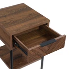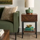 Elevate your living space with the Wyatt Geo End Table , where modern elegance meets craftsmanship. This charming side table is a versatile companion for your daily life. Imagine having your essentials within arm's reach, neatly stored away in the upper drawer. From remotes to keys, or even a cherished novel, this table keeps everything organized while adding a dash of style. The drawer boasts a contemporary herringbone pattern, enriching the table's texture and depth, making it a standout piece. The open shelf offers the perfect spot for your decorative pieces, greenery, or your favorite magazines, blending functionality with aesthetic appeal. Resting on sleek black metal legs, this side table presents a modern silhouette that complements its rich brown finish beautifully. The minimalist design adds a contemporary touch, and the quality engineering ensures stability and durability for years to come. Designed to harmonize with any room, the Wyatt Geo End Table pairs splendidly with the Wyatt TV Console, Coffee Table, or other items from the Better Homes and Gardens Wyatt Collection (sold separately). Whether it's set beside a cozy sofa or a comfy armchair, this side table is a chic and practical addition to your home. Its blend of form and function effortlessly enhances any decor, bringing a timeless charm and a touch of sophistication to your living space. Upper storage drawer for stowing remotes or other small accessories Large open lower shelf Spacious tabletop for conveniently placing remotes, books, or beverages Stylish herringbone pattern drawer fronts Soft-closing, ball-bearing drawer glides Sleek, modern finger pull drawer handles Black metal legs Walnut brown finish Pair with other items from the Wyatt Collection (Sold Separately) Assembly required Dimensions: 17 in x 18 in x 25.25 in (43.2 cm x 45.7 cm x 64.1 cm) Packaging Dimensions: 22.5 in x 20.375 in x 13.5 in Model# BH1425004710002