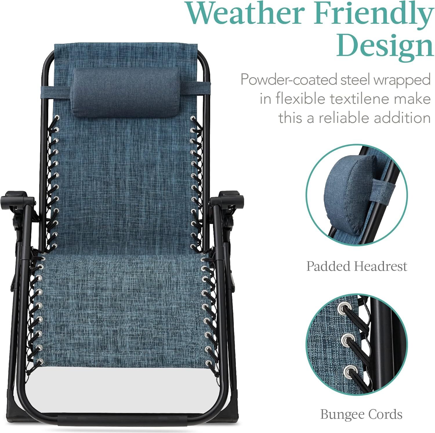 The item was shipped through US Stock, so it arrived faster than expected Overs ized Zero Gravity Chair, Folding Outdoor Patio Recliner, XL Anti Gravity Lounger w/Removable Cushion, Cup Holder, Side Tray, 350lb Capacity - Graphite Blue Brand Best Choice Color Graphite Blue Product Dimensions 63"D x 27"W x 44.5"H Size 63 Inch D x 27 Inch W x 44.5 Inch H Back Style Solid Back About this item PLUSH REMOVABLE CUSHION: A soft linen cover comes with a set of zippers for easy removal and cleanup, while the plush cushion adds comfort WEATHER-FRIENDLY DESIGN: Durable textilene over a powder-coated steel frame supports up to 350 pounds, so you can lounge in peace with a convenient side tray, knowing this seat is ready for all seasons EXTRA-WIDE SEATING: Padded linen with flexible textilene conforms to your body, while an adjustable headrest helps relieve tension in the neck while lounging LOCKABLE RECLINING SYSTEM: An extra-wide seat smoothly glides into adjustable zero-gravity positions with a system of locks and elastic cords for extra support VERSATILE FOLDING RECLINER: Add this chair to your next day at home or outdoor excursion and turn any space into a private lounge; fold it flat for easy storage after use; OVERALL DIMENSIONS: 32.5-63"(L) x 27"(W) x 33.5-44.5"(H); WEIGHT CAPACITY: 330 lbs.