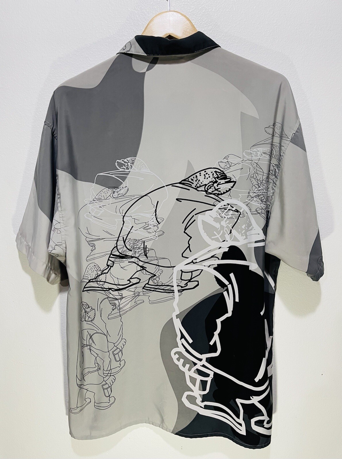 Sleeve Length:Short SleeveClosure:ButtonMaterial:PolyesterPattern:Graphic PrintSize Type:RegularBrand:KomanCollar Style:Stand-UpColor:GrayDepartment:MenType:Button-UpSize:LCountry/Region of Manufacture:Korea, Republic ofTheme:Punk, Sports, Graphics, Art To Wear
