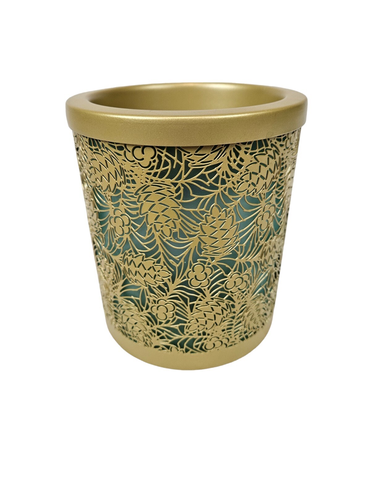 Yankee Candle Gold & Green Pinecone Scenterpiece Electric Glowing Wax Warmer In like new condition Yankee Candle Gold & Green Pinecone Scenterpiece Electric Glowing Wax Warmer. With an electric lit candle inside, this frosted scenterpiece warmer comes to life with flickering and glowing pinecones. Balsam Branches A fall and winter delight! With a timer power cord, you can place this warmer just about anywhere you like. It’s so easy to change scents in seconds—to match your mood, your day, your crazy busy life. Yankee Candles innovative Easy MeltCups release room-filling fragrance for enjoyment in just minutes. Place an Easy MeltCup in the Scenterpiece® warmer and turn it on. That’s it (really!). When you’re ready to change scents, pick up the cool-to-the-touch MeltCup and switch it out for another one. No wax to touch, no wax to clean. Easy MeltCups stack and store easily…bonus! Features quicky change fragrances with heat resistant meltcups, flameless warmer provides room filling fragrance, indicator light illuminates when warmer is on, automatic shut off (3, 6, or 9 hour setting), LED lights creates added ambiance, no messy clean up. Measurements height 6" diameter 5.25" This is a pre-owned item that may show signs of wear. In like new condition, no flaws.