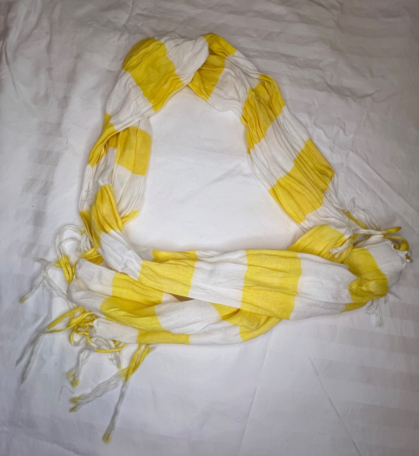 Striped Yellow and White Lightweight Scarf Fringe Y2K Good pre-owned condition - no stains, rips or tears. Approximate measurements: Length: 60" Width: 18" Fast shipping - returns accepted!