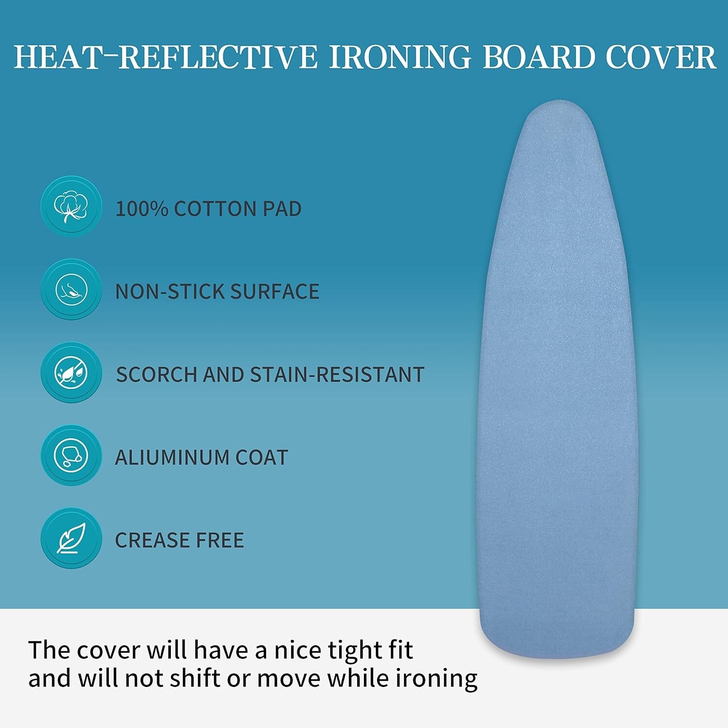 About this item ZOES HOMEWARE BASIC IRONING BOARD COVER AND PAD 【MATERIAL】:The ZOES HOMEWARE ironing board cover is designed to speed up your ironing time with its heat reflective technology. Made from 100% breathable cotton, it ensures a wrinkle-free and smooth finish. The pad is constructed with three layers of composite pure cotton interlayer with varying densities, and the pure cotton cover is covered with thousands of aluminum foil dots. This design can increase your ironing efficiency by 30-50% by reflecting heat. 【SIZE】:ZOES HOMEWARE 15"x54" full size ironing board cover and pad is designed to fit full size ironing boards. The design of elastic edges allows it to fit ironing boards with lengths ranging from 50 to 56 inches and widths ranging from 13 to 17 inches. It's also quilted for extra protection and durability - no more wrinkled, scorched, or torn ironing board covers.Best for steam generator irons 【FEATHERS】:The high-density cotton padding can withstand up to 260 degrees without fading or warping, even after thousands of uses. Continuous ironing for more than 30 minutes will not scorch. The aluminum foil coating ensures 100% no staining. It's also quilted for extra protection and durability - no more wrinkled, scorched, or torn ironing board covers. Suitable for all kind of irons. 【NOTE】:(1) Please ensure that you select the appropriate size for your ironing board before placing your order. (2) To reduce our costs and selling price, we use a smaller package size. As a result, the product may have wrinkles upon arrival, but these can be easily removed by ironing. (3) The cloth cover does not have Velcro straps and instead uses elastic edges for easy attachment to the ironing board.