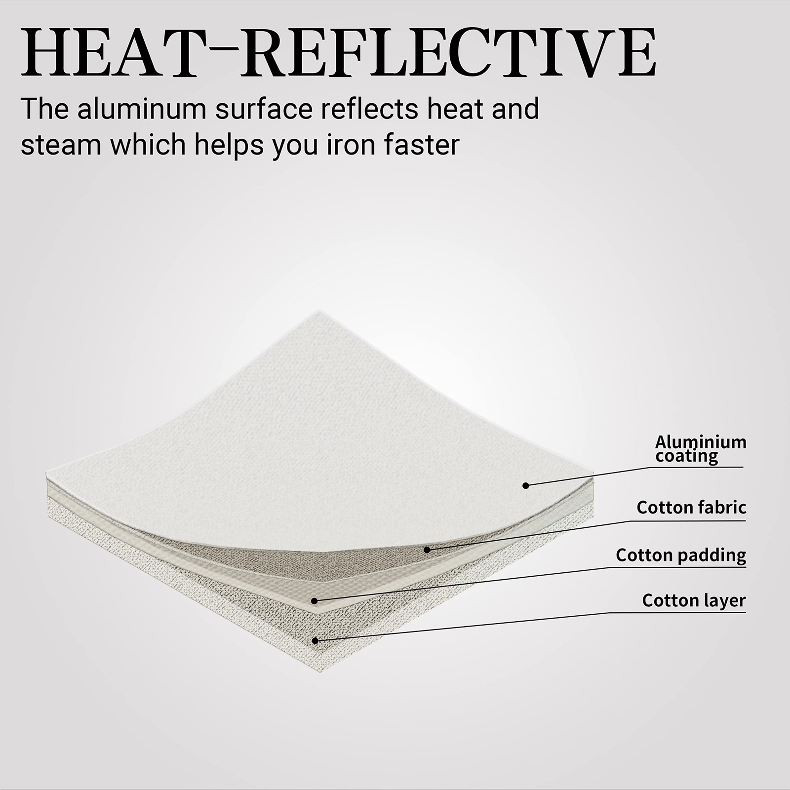 Our ironing board cover is made of pure cotton and is carefully processed to provide a soft and comfortable experience. It also has excellent heat insulation properties to protect your clothing from burns. Simply place it on your ironing board for effective protection. In addition, our ironing board cover prevents burns and scorching on the ironing board surface, keeping it clean and neat. Overall, choosing our ironing board cover not only makes your ironing work easier, but also keeps your clothes in perfect condition. It's the ideal choice for you! BASIC IRONING BOARD COVER AND PAD 【MATERIAL】:The ironing board cover is designed to speed up your ironing time with its heat reflective technology. Made from 100% breathable cotton, it ensures a wrinkle-free and smooth finish. The pad is constructed with three layers of composite pure cotton interlayer with varying densities, and the pure cotton cover is covered with thousands of aluminum foil dots. This design can increase your ironing efficiency by 30-50% by reflecting heat. 【SIZE】:15"x54" full size ironing board cover and pad is designed to fit full size ironing boards. The design of elastic edges allows it to fit ironing boards with lengths ranging from 50 to 56 inches and widths ranging from 13 to 17 inches. It's also quilted for extra protection and durability - no more wrinkled, scorched, or torn ironing board covers.Best for steam generator irons 【FEATHERS】:The high-density cotton padding can withstand up to 260 degrees without fading or warping, even after thousands of uses. Continuous ironing for more than 30 minutes will not scorch. The aluminum foil coating ensures 100% no staining. It's also quilted for extra protection and durability - no more wrinkled, scorched, or torn ironing board covers. Suitable for all kind of irons. 【NOTE】:(1) Please ensure that you select the appropriate size for your ironing board before placing your order. (2) To reduce our costs and selling price, we use a smaller package size. As a result, the product may have wrinkles upon arrival, but these can be easily removed by ironing. (3) The cloth cover does not have Velcro straps and instead uses elastic edges for easy attachment to the ironing board.