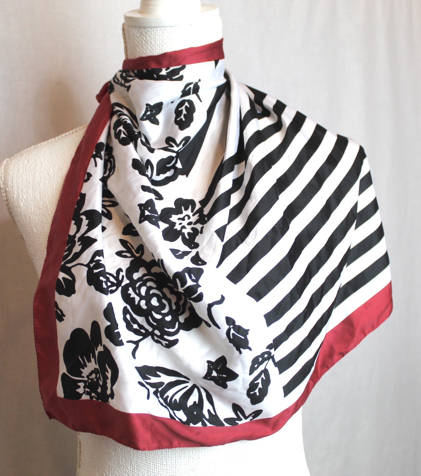 Zara Hand-Rolled Striped Floral Scarf 20x20 Red White Black
