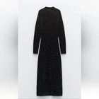 long dress with high collar and long sleeves, open back detail stretchy true to size with stretch M-pit to pit 18" length 54" L- pit to pit 19" length 54 shimery, metallic, classy, minimalist, contemporary, cruise vacation dress, or any special occasion events