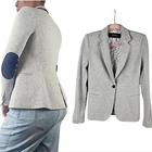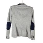 Zara Single Buttoned Denim Elbow Patch Grey Blazer. Size S. Single button, lapel collar, two welted front pockets, denim elbow patches, as well as denim on back collar, buttoned cuffs, and fully lined blue geometric pattern. Measurements are approximate. Blazer in good preowned condition. chest 17" sleeve 24" length 23" material 60% cotton 40% polyester lining:100% acetate stretch No N1145 11/12