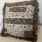 Add a touch of country charm to your bedroom or living room with this vintage 1970s brown and ivory throw pillow. The pillow features a faux patchwork fabric quilt with a floral pattern, ribbon trim, lace trim, and ruffled edges. Measuring 14 x 14 inches, it is the perfect size for both snuggling up to and displaying on your couch. Crafted by hand with care, this original and authentic pillow is made of high-quality cotton material and filled with pillow form. It is easy to care for with hand wash instructions. This unique addition to your decorative bed pillows and bed & bath linens collection is sure to impress your guests and add a cozy touch to your home. The fabric the pillow is made of is pre-quilted cotton.