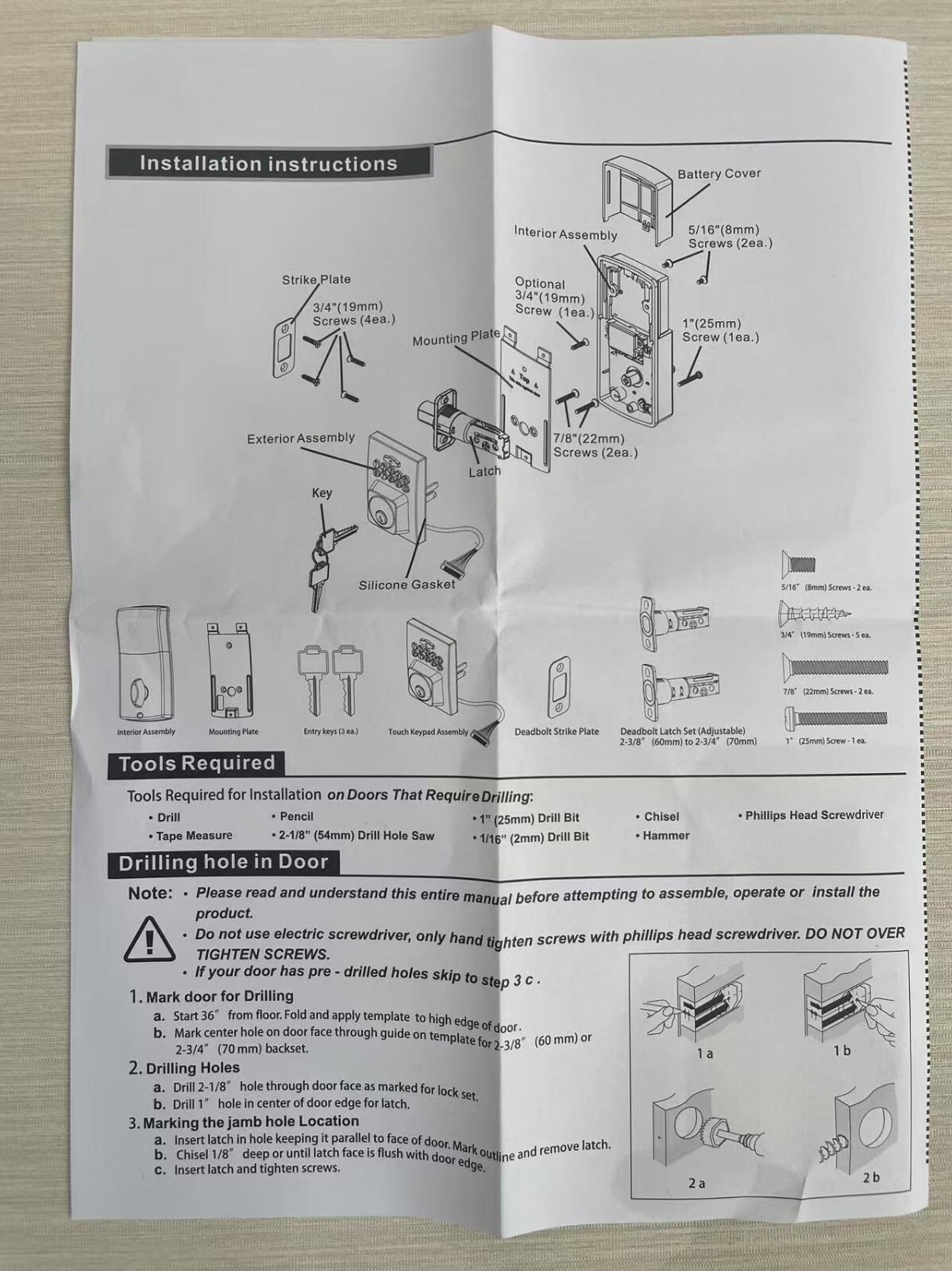 KEYLESS ENTRY CONVENIENCE: Experience the ease of touch-control with our keyless entry door lock. This electronic deadbolt door lock offers secure access, keeping your home protected CUSTOMIZABLE SECURITY CODES: Secure your home with a digital door lock that allows 50 user codes AUTOMATIC LOCKING FEATURE: Enjoy peace of mind with a keypad deadbolt lock featuring automatic locking that secures your door 10 to 99 seconds after entry VERSATILE DOOR COMPATIBILITY: This keypad door lock is designed to fit standard door preparations, accommodating door thicknesses of 1-3/8 to 1-3/4 inches DUAL OPERATION OPTIONS: Use the keypad deadbolt for easy access or a traditional key outside, complemented by a thumb turn lock inside for flexible and reliable security options battery does not included. 4 X AA battery can last about 1 year of usage.