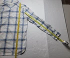 This is a Levi's casual button-up dress shirt for men with a plaid pattern in blue and white. It has long sleeves, a button-down collar, and is suitable for casual occasions. The shirt is in size M.