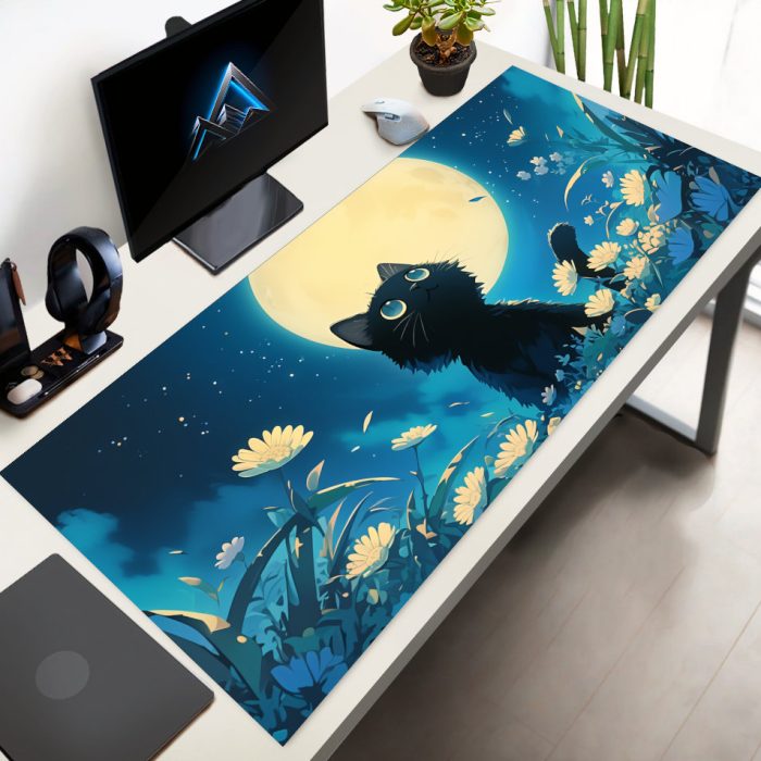 Full Moon Cat Desk Mat, Cute Black Cat, Starry Night Desk Mat, Moon Mouse Pad, Flower Desk Mat, Night Mouse Pad, Kawaii Cat Desk Mat, Lofi