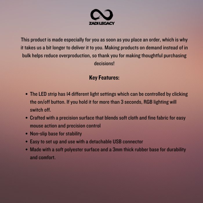 Crafted with a precision surface that blends soft cloth and fine fabric, this LED mouse pad is both durable and comfortable. Its non-slip base ensures that it stays securely in place during use. We stand behind the quality of our products and are committed to ensuring that our customers are satisfied with their purchase.