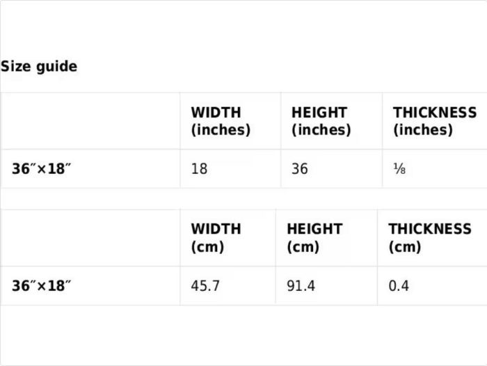 • Sizes: 36″ × 18″ (91.4 cm × 45.7 cm), 18″ × 16″ (45.8 cm × 40.7 cm)